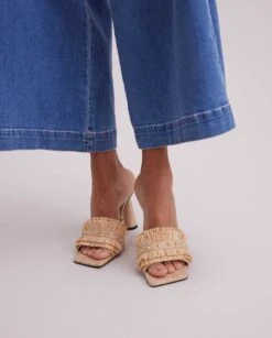 The ALVAR is a natural leather slide sandal featuring a cone heel. The ALVAR are enhanced with raffia fringe and gold studs. The covered leather heel is a comfortable 3 inches in height.