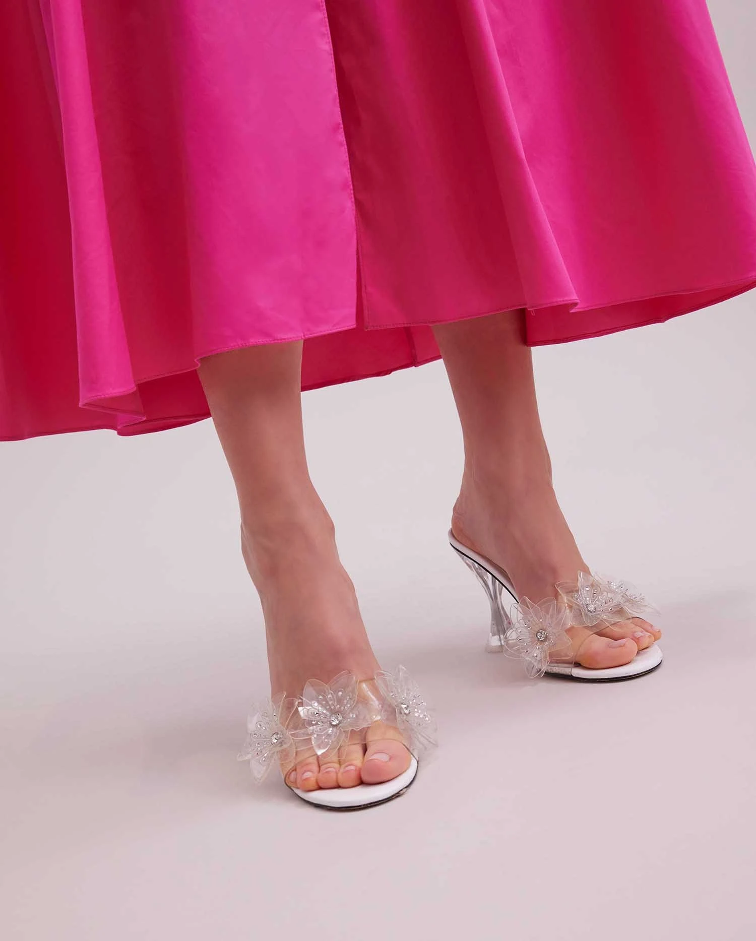 The AYALA is a leather slide sandals with a clear architectural heel. These sandals are enhanced with a clear PVS front strap adorned with clear flowers that have crystal stone centers. The clear heel is a comfortable 3 inches in height.