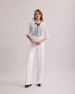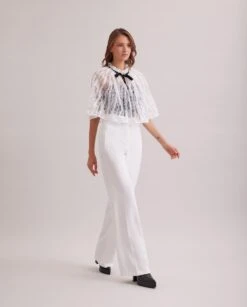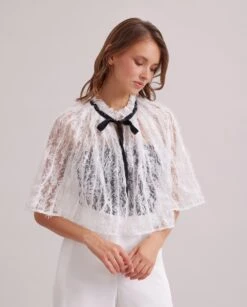 Crafted from a beautiful sheer white lace, our BOVARY cape is one you’ll want to wear over and over again. Featuring vertical eyelash trim and a soft grosgrain ribbon that wraps around your neck and ties in front, this piece is sure to earn a spot in your wardrobe.