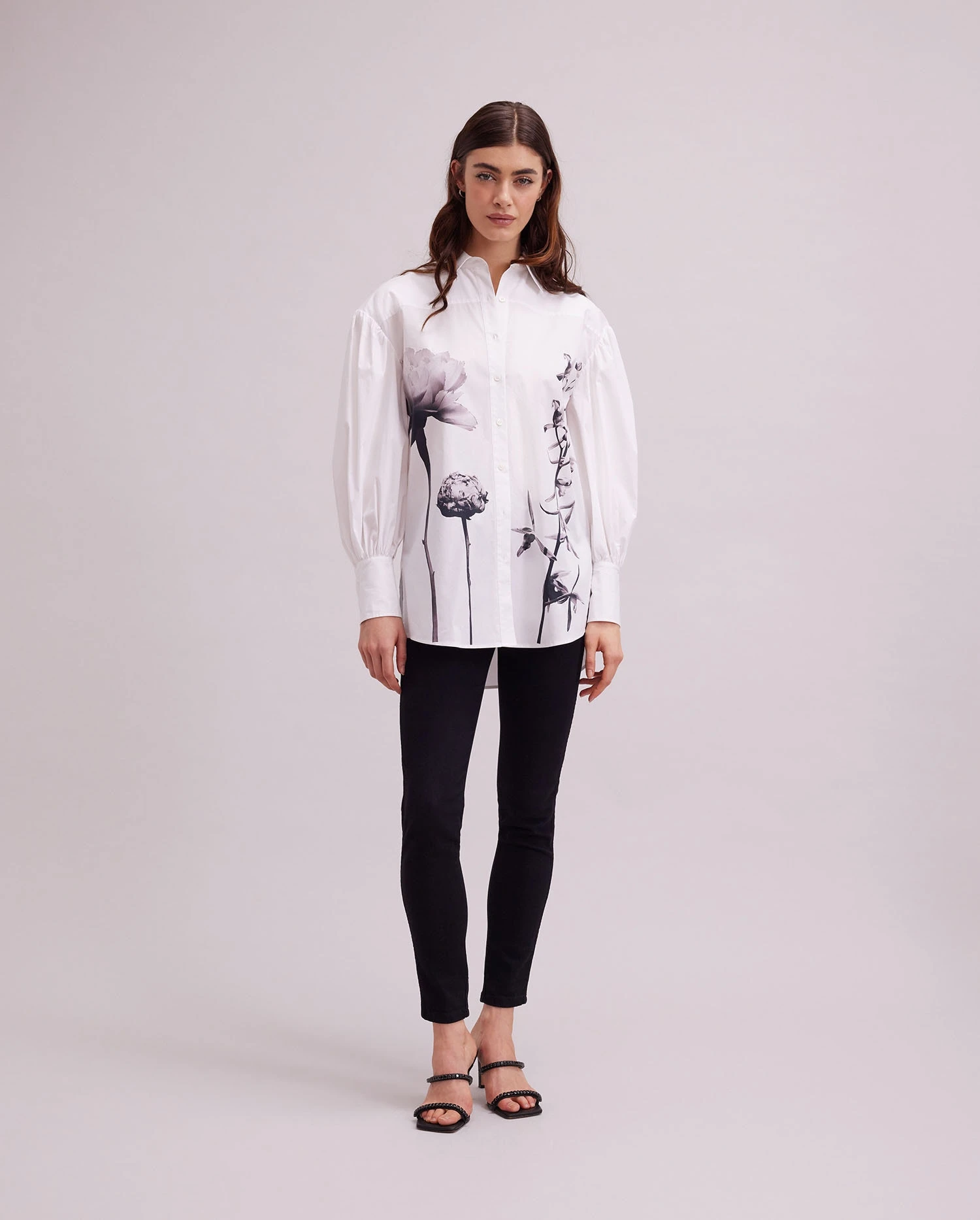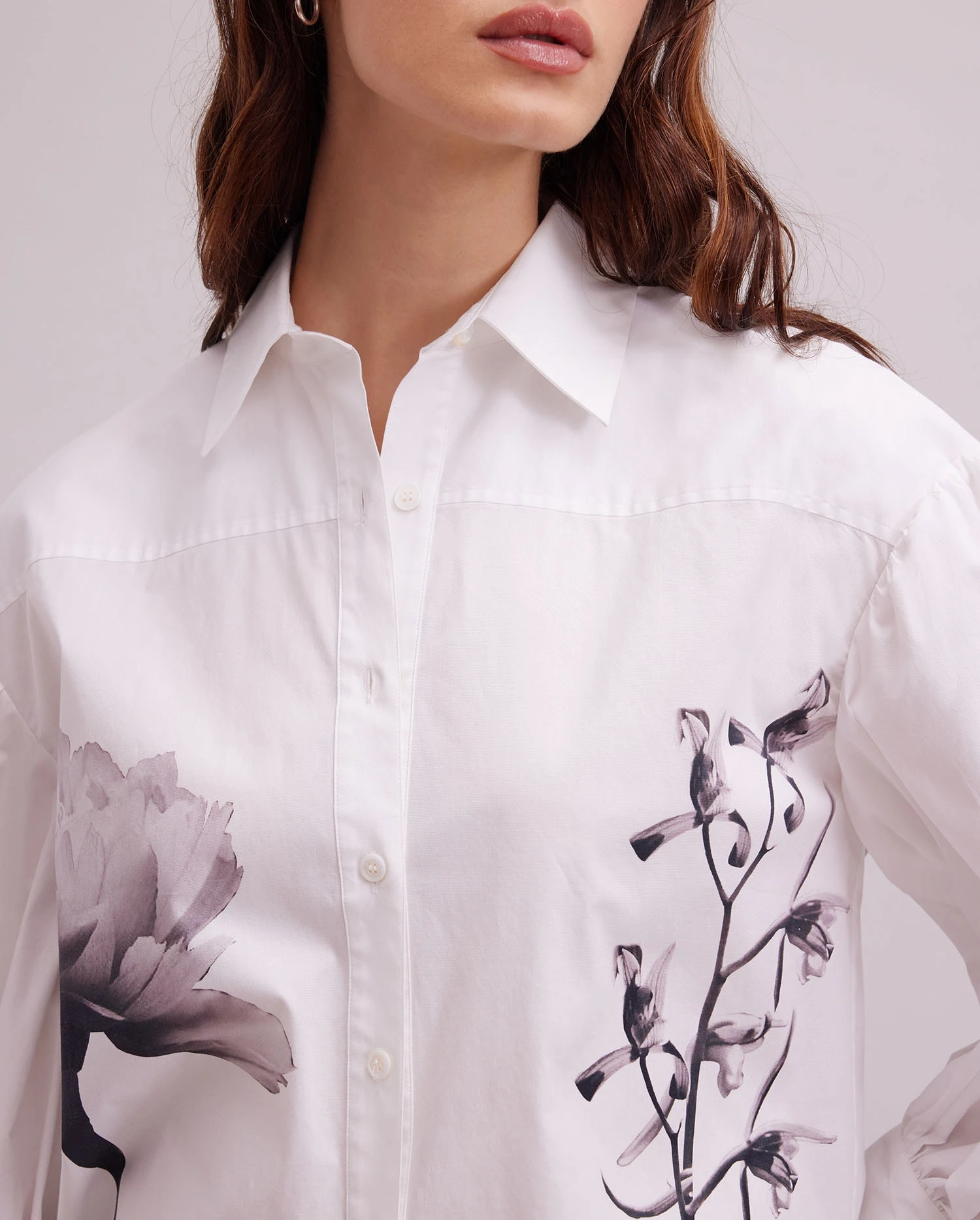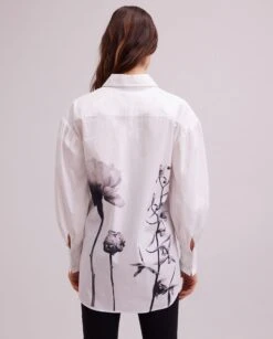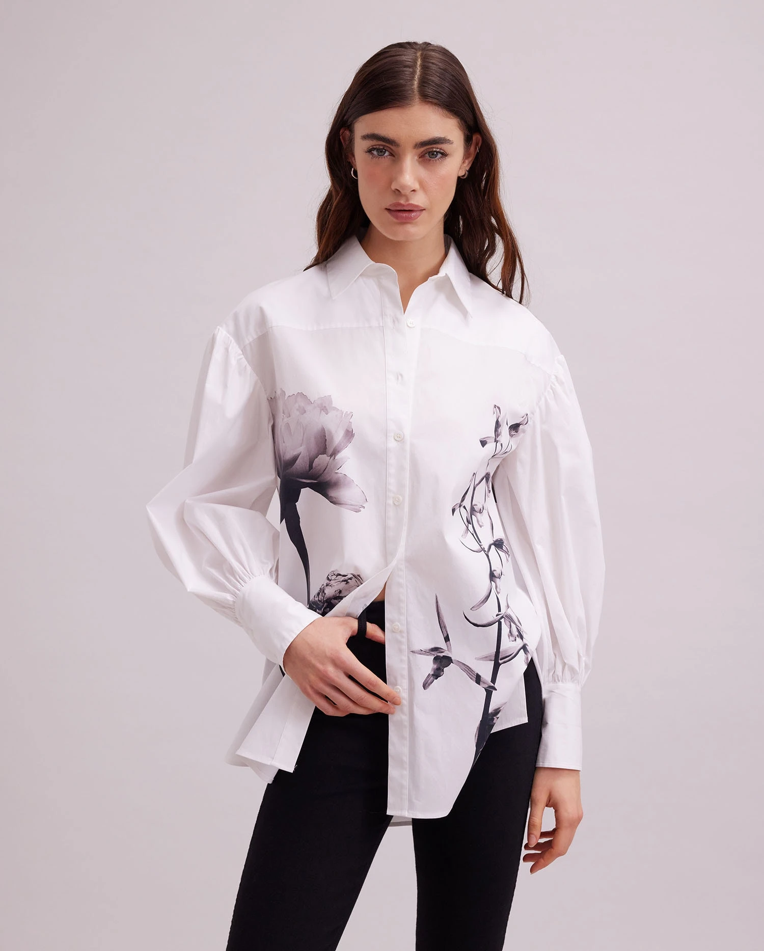 Made from cotton poplin and printed with photographs of flowers, The Clay is a statement shirt that will make you feel like the height of style. The point collar and center button placket make for a classic look that can be paired with your favorite skirt or worn untucked. The high low hem allows for a relaxed fit while the side seams slits ensure comfort. Finished with French cuffs and mini ruching, this shirt is the perfect addition to any closet.