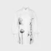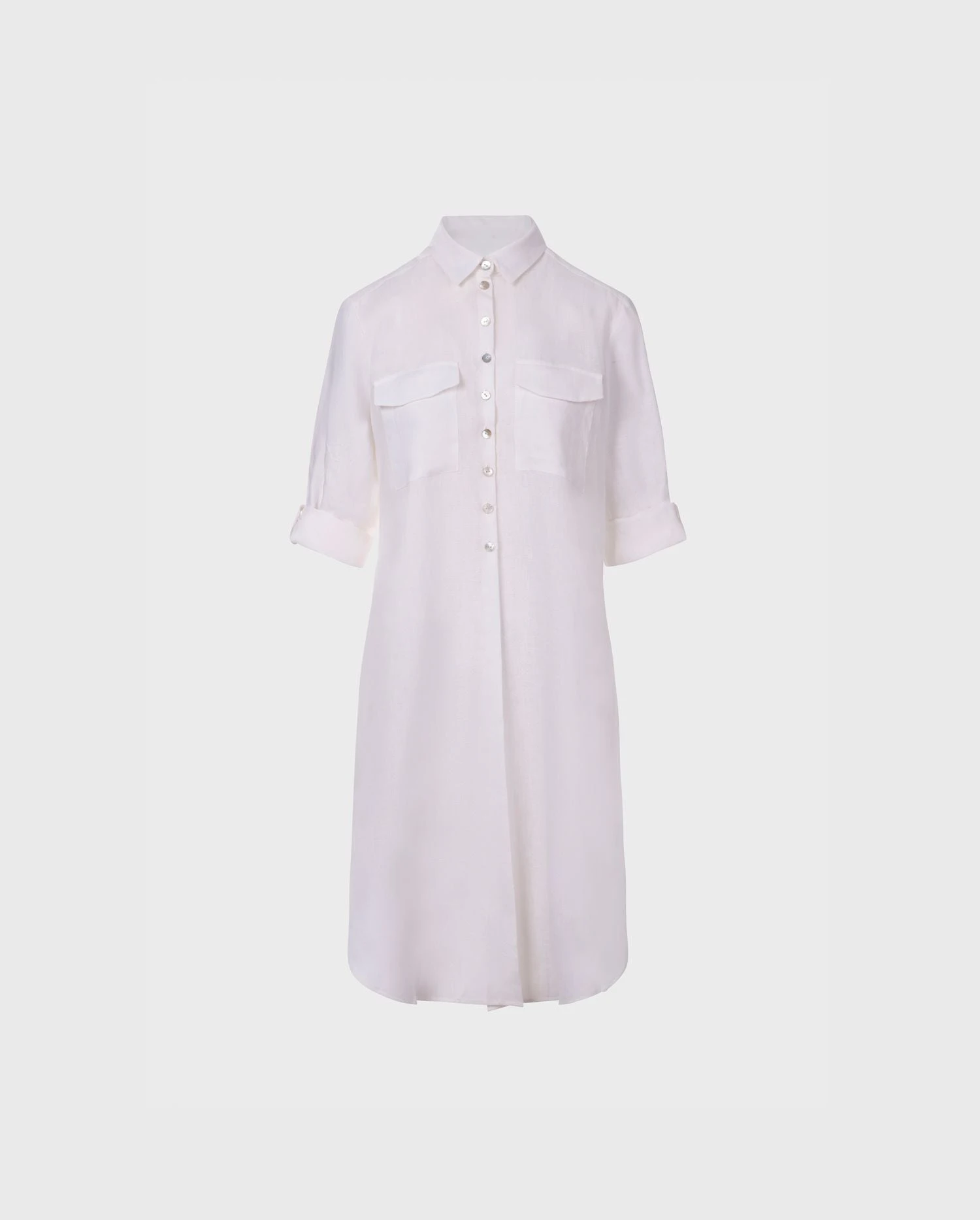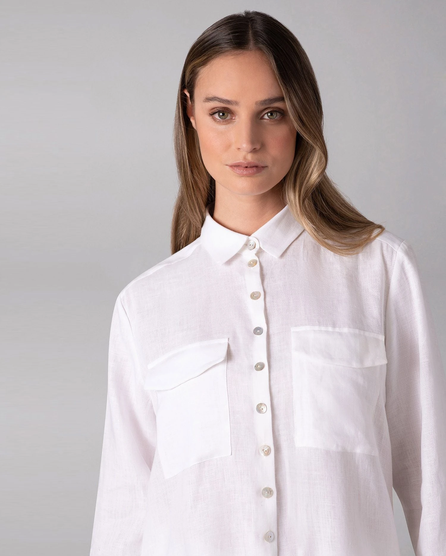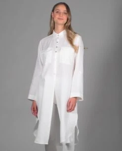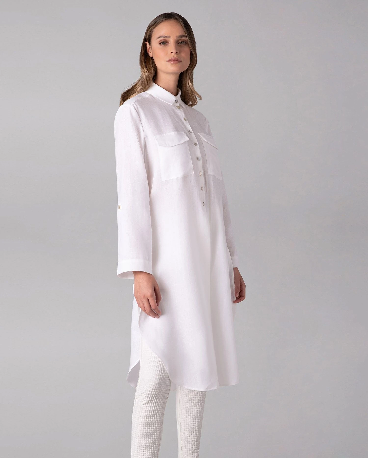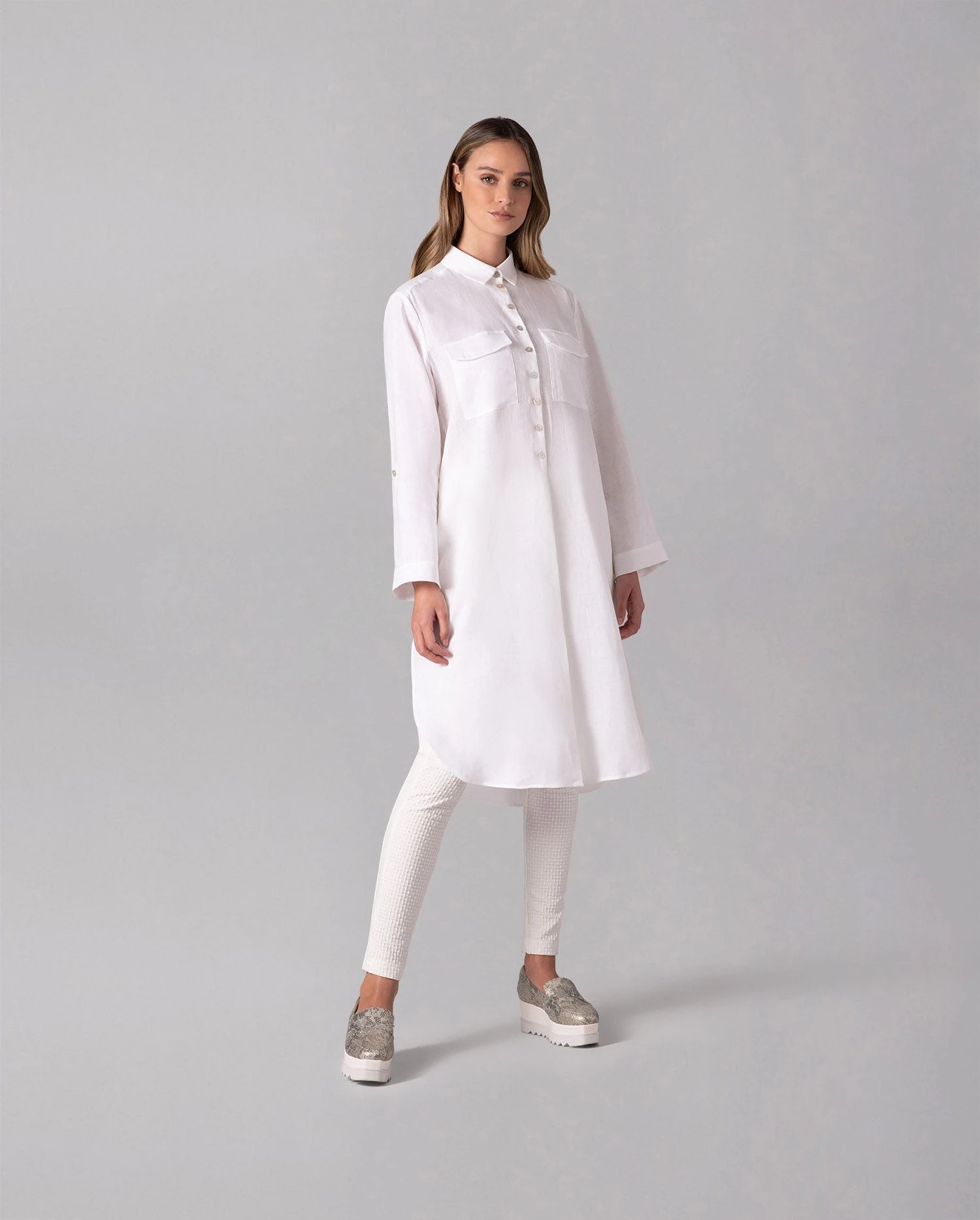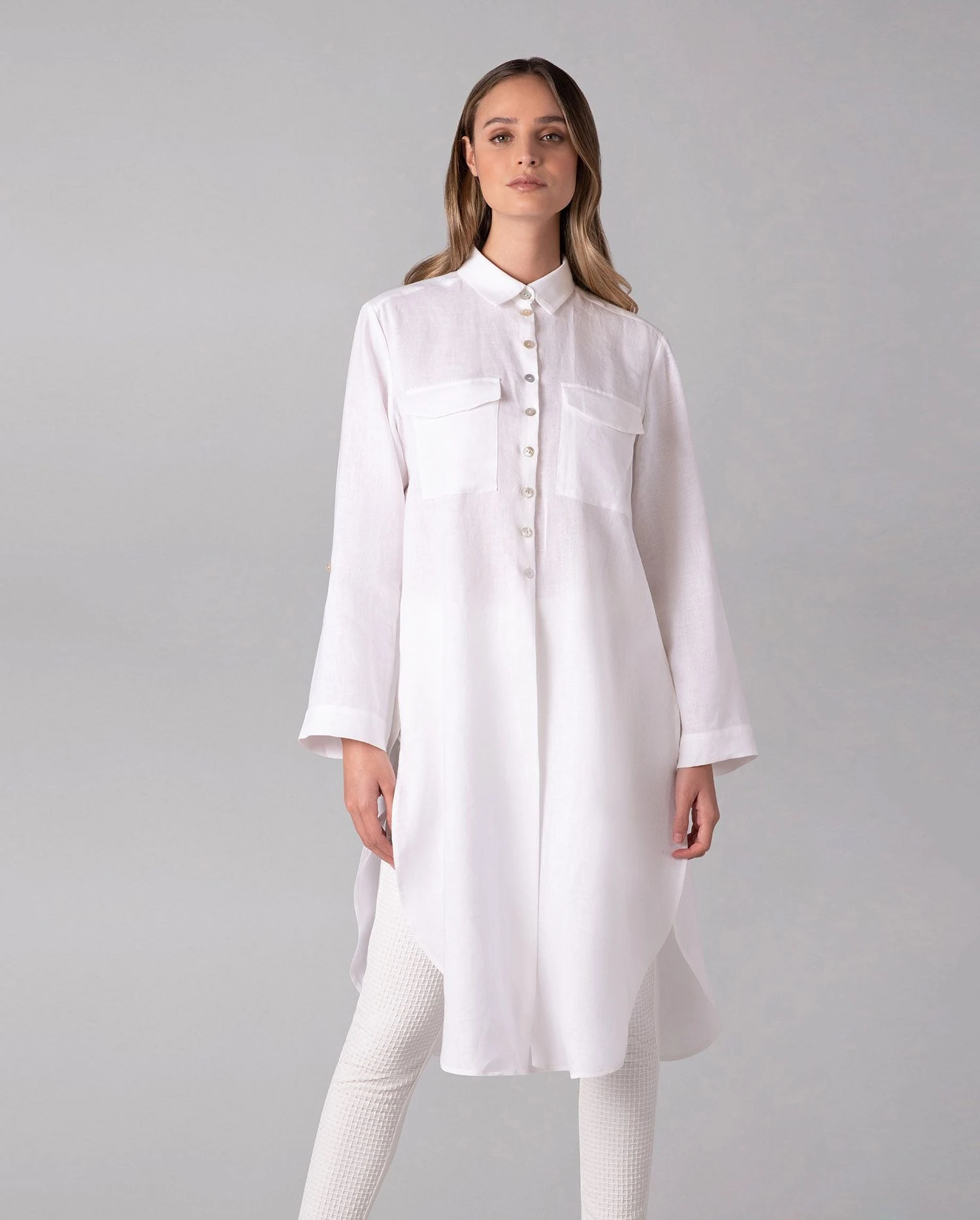 The COMETE is a tunic-length shirt with mother of pearl buttons that run from the collar to halfway down the piece. This linen tunic has a classic point collar and two flap patch pockets on either side of the chest. The wrist-length sleeves can be rolled up and cuffed with a tab and button detail. This shirt features a rounded bottom hem while the sides have slits that stop halfway up. There are no darts or seams which allows the tunic to be fluid and flow freely. In the same theme, you will find the COME shirt and the CASTAWAY pants.
