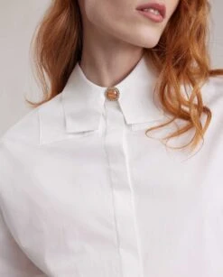 With meticulous attention to detail and a modern twist on a classic white shirt, our CONTE takes a sophisticated approach to this timeless piece. The single jeweled button at neck, the yoke panel in front and back, and side ties make it the ideal addition to any wardrobe.