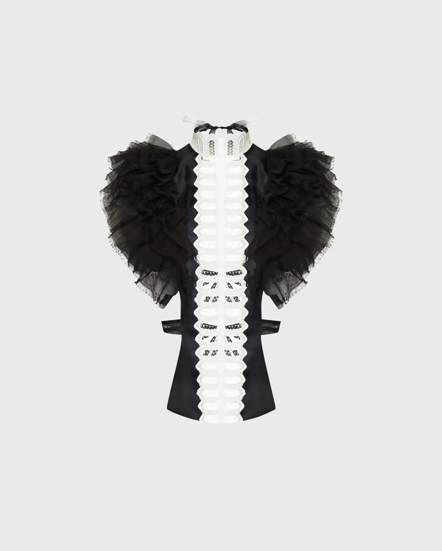 - Two-tone shirtfront collar with chiffon ruffle sleeves