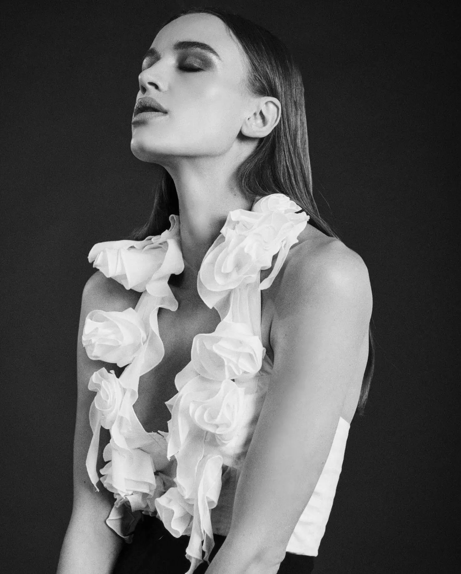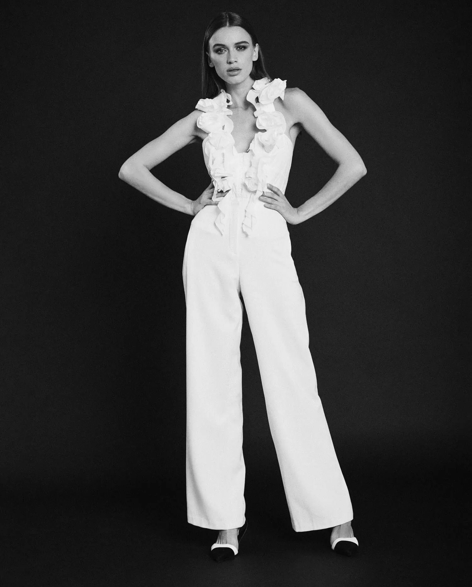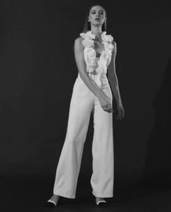 The FAHELA is a sleeveless, halter style shirt with a deep V-neckline and symmetrically placed Rosettes. Anne wanted to make you feel like you were covered in the beauty of this signature flower, making you feel like the une jolie femme, strolling the Paris parks as the flowers are in bloom. The Rosette flower is her favorite to add to a style, to give it that special feminine touch. The way the fabric gives life to this flower shape always excites and inspires Anne. The FAHELA fits close to the body and has vertical strips of boning to keep its shape.