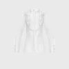 A white sheer lace blouse featuring vertical eyelash trim throughout, the FLAUBERT is both classic and contemporary. The round neck features an elegant keyhole opening in front with a single button closure using an ornate crystal and pearl button. The sleeves are straight to the elbow then release to a large circle finish. It is the perfect piece for evening events and special occasions.