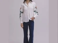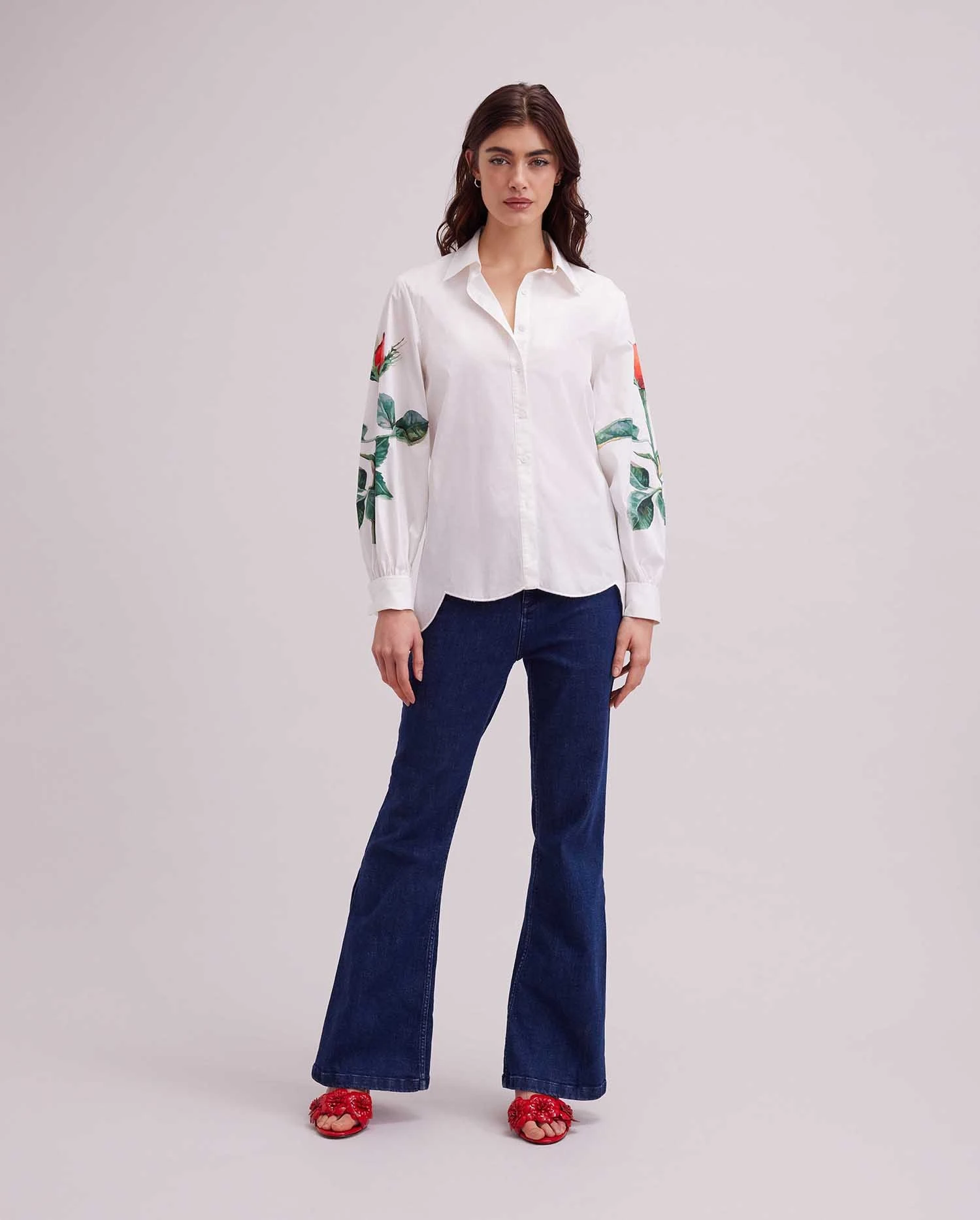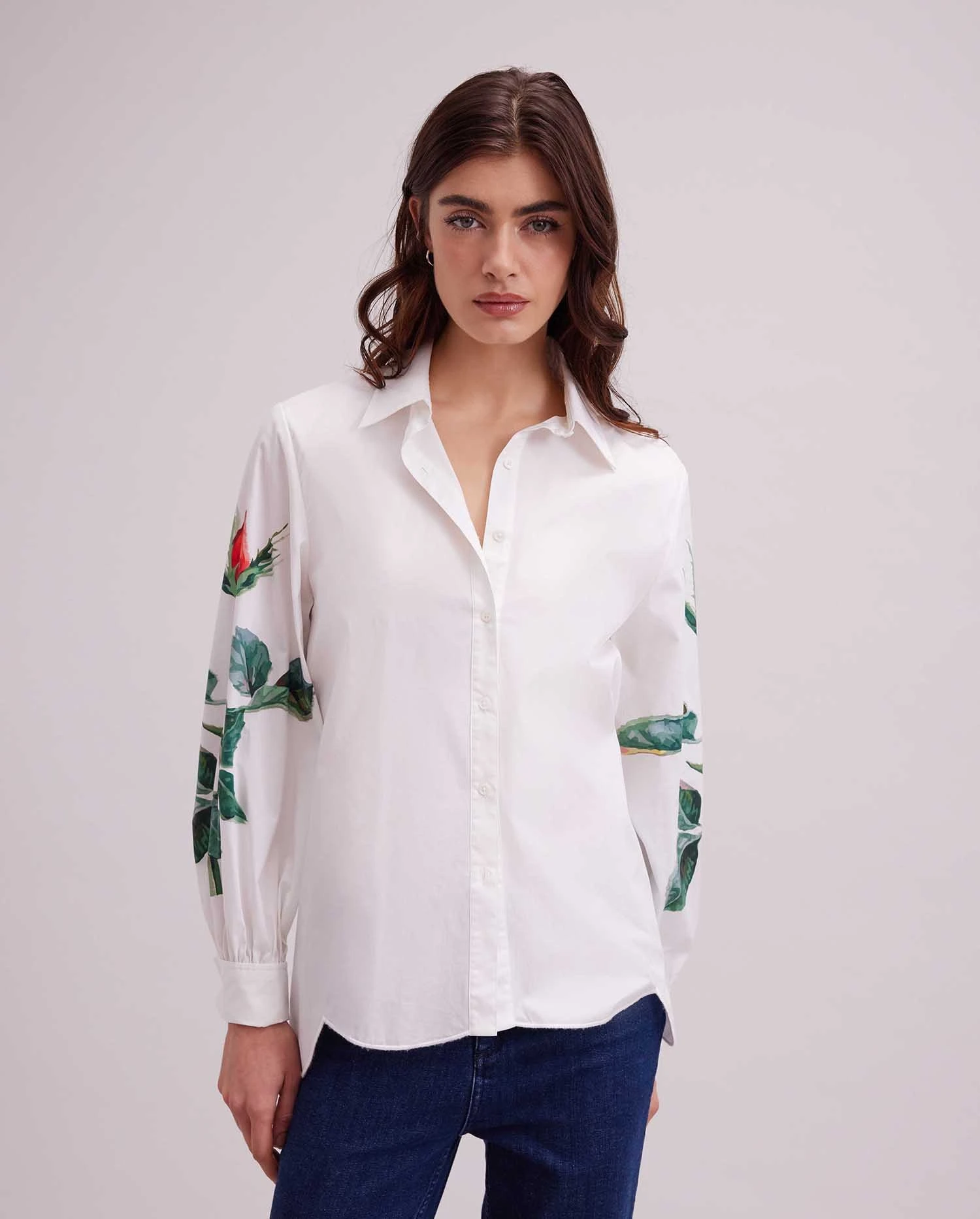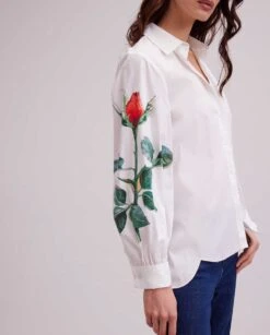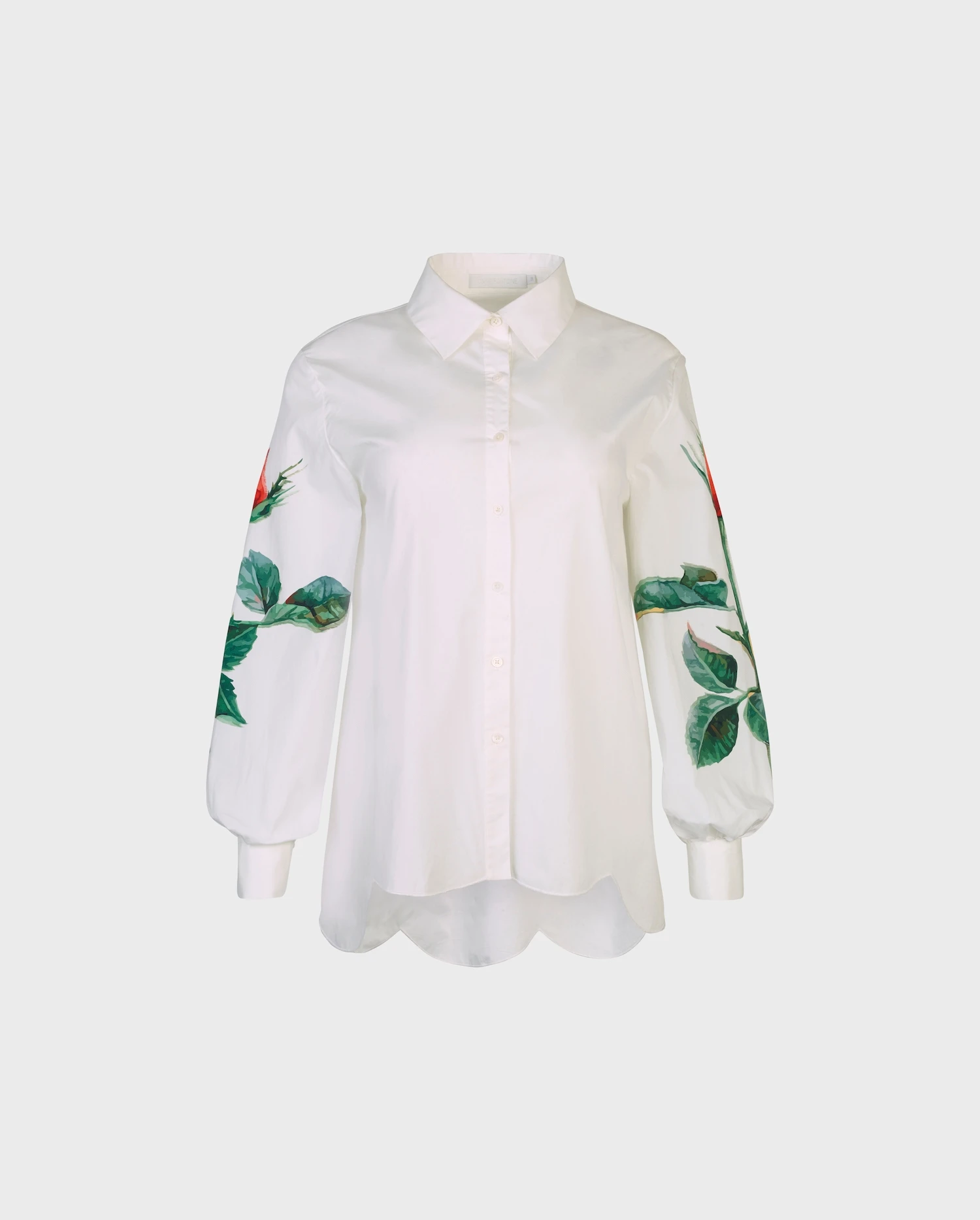 The FLOWERS shirt is the perfect way to show your appreciation for spring’s blooms. This lightweight tunic length shirt features a classic point collar and center button placket. The long sleeves are loose and gather at the French cuff that allow for cufflinks. The bottom hem is high low and features large scalloped edges. The sleeves also feature a single printed rose on each arm. This is a piece you will wear again and again!