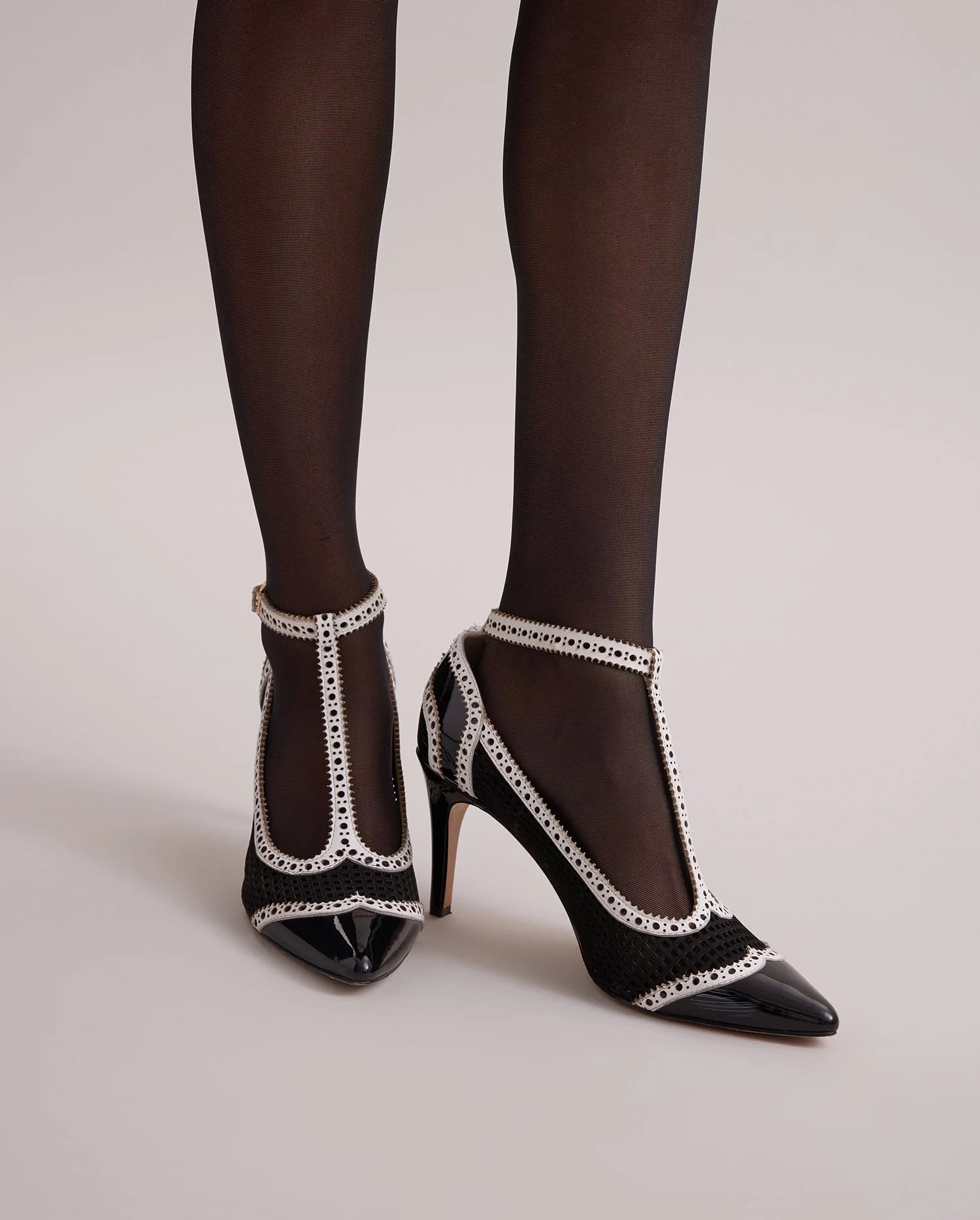 You’re bound to leave an impression in the HEMINGWAY. The t-strap heel features a patent leather point toe front and an open net suede center, all trimmed in white eyelet with tiny scalloped trim for a sophisticated finish.