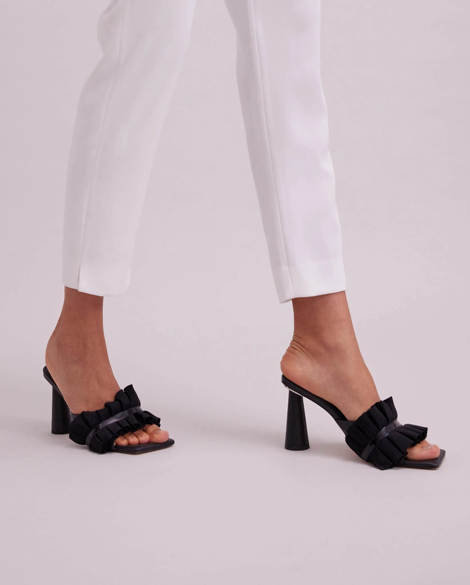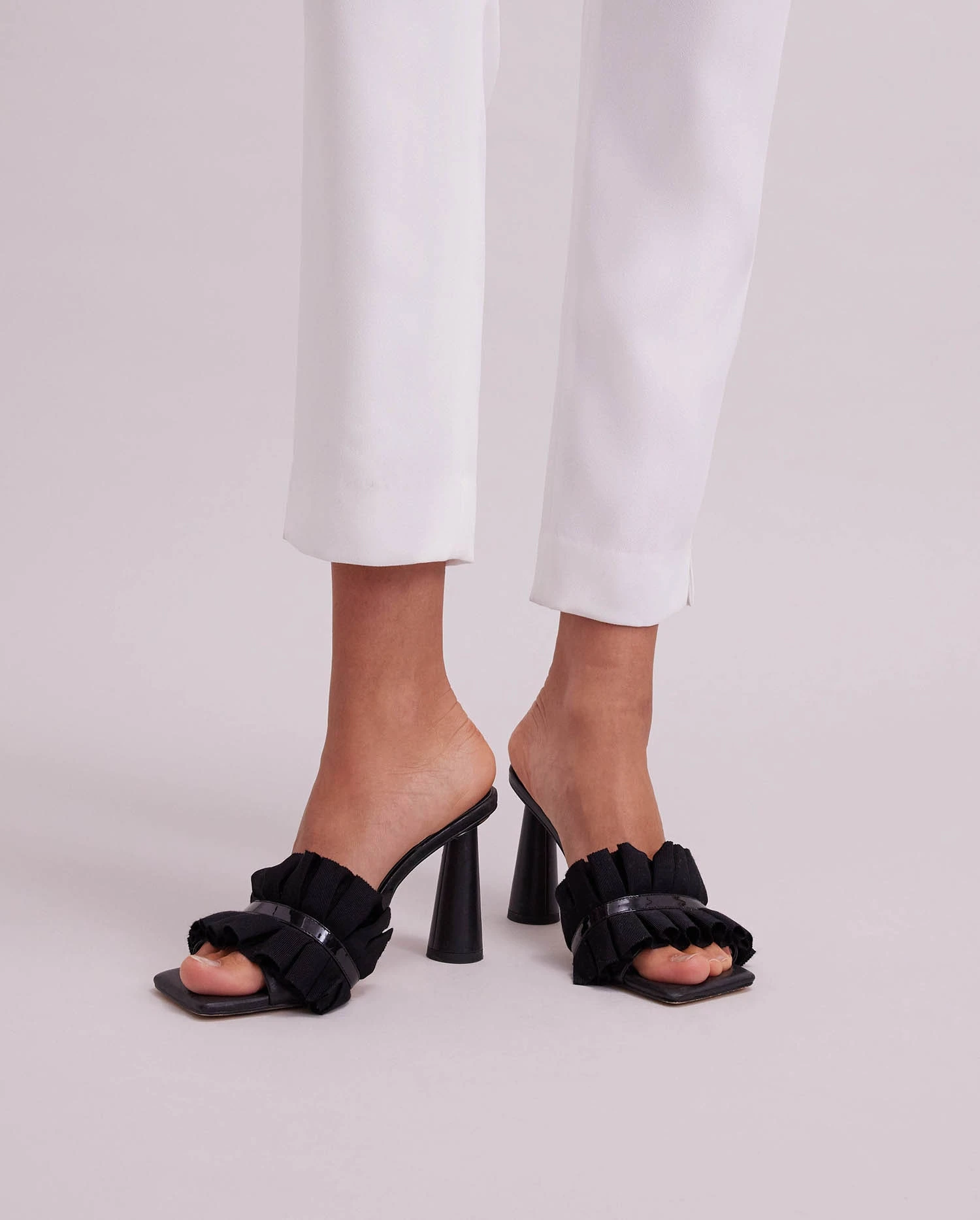 The MUXICA is a leather slide sandals with a cone heel. These sandals are enhanced with monochrome suede ruffles. The covered leather heel is a comfortable 3 inches in height.