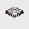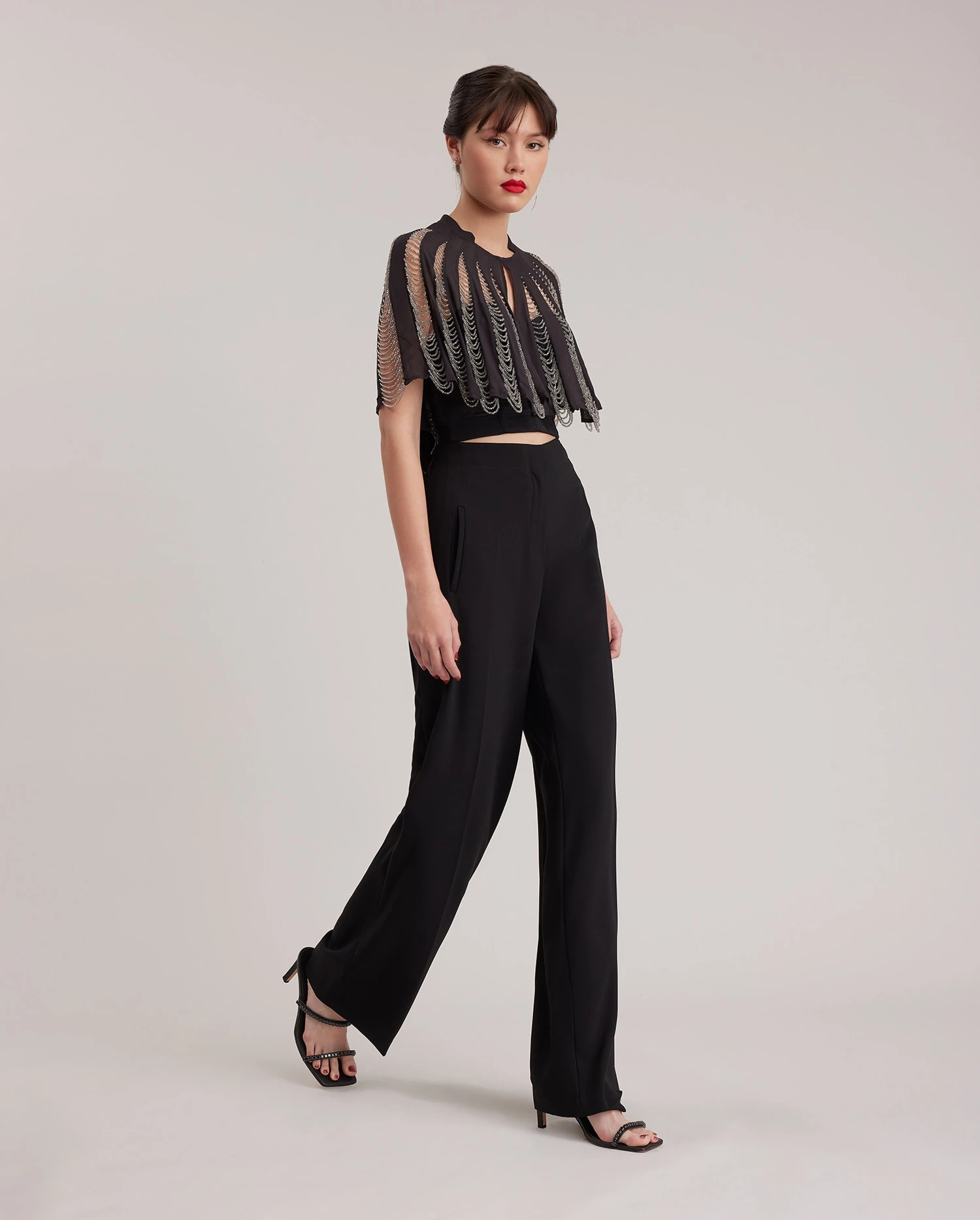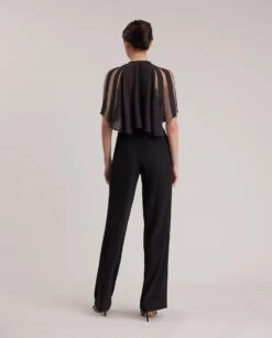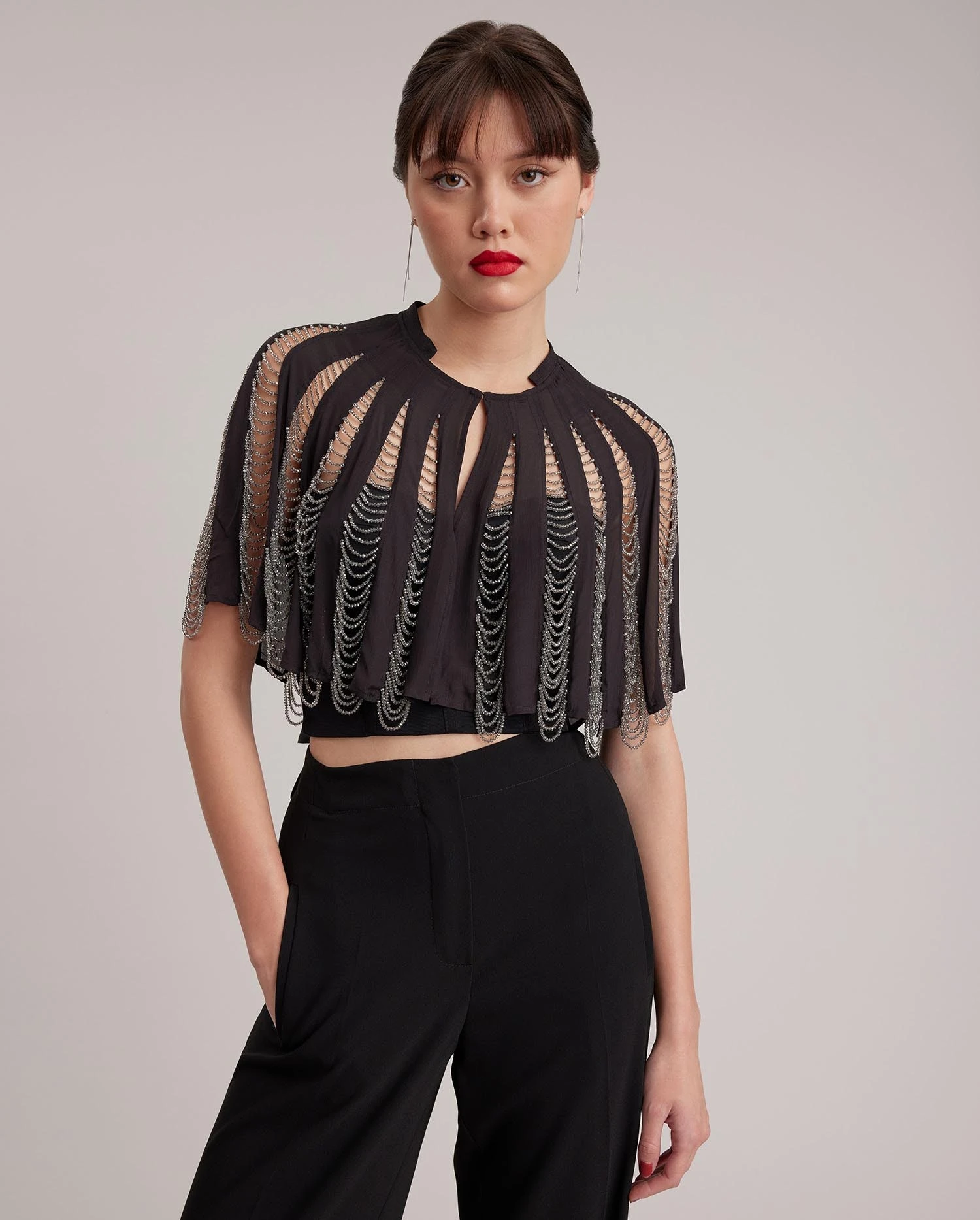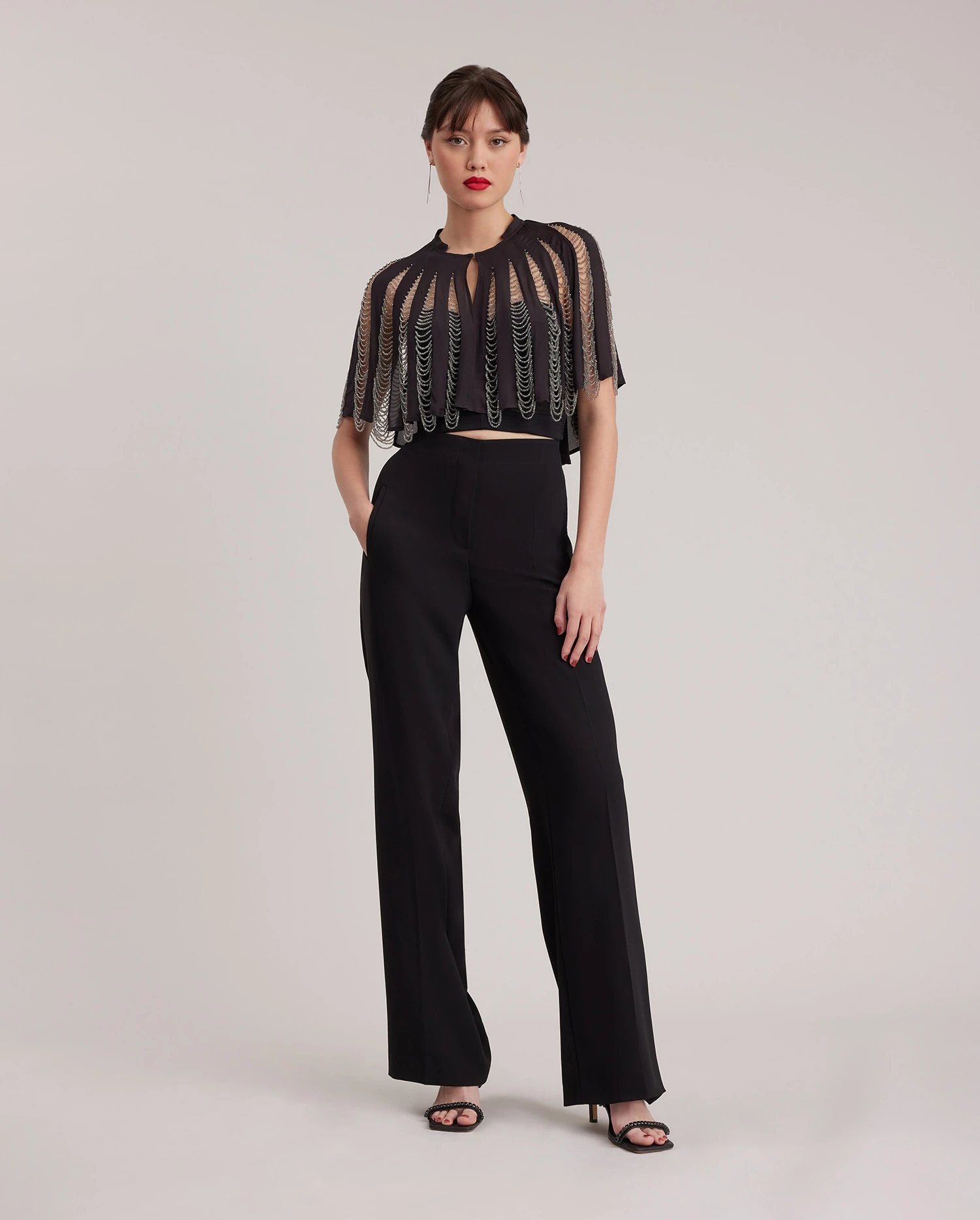 The NERA is a black silk cape highlighting rows of delicate silver beading with a small covered button for closure. The NERA cape features a boat neckline and columns of sheer paneling.
