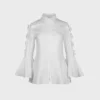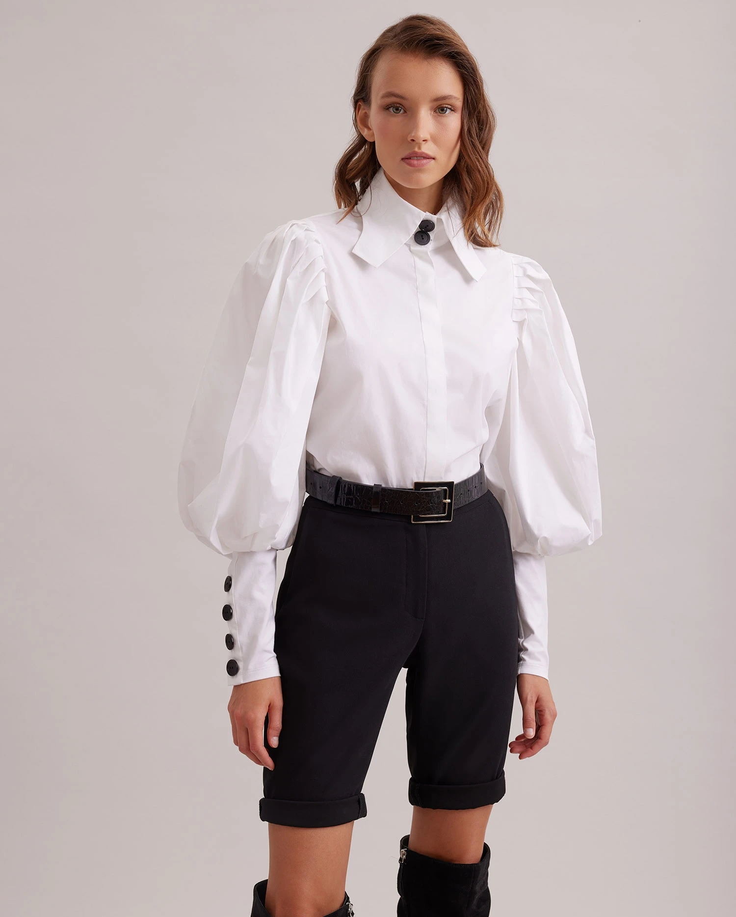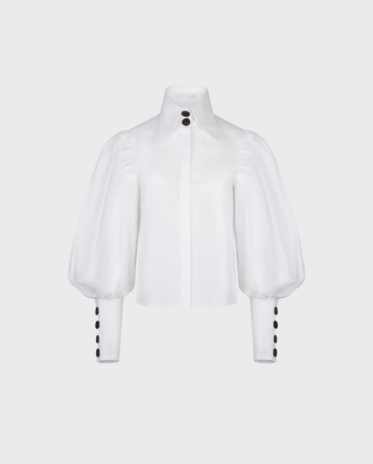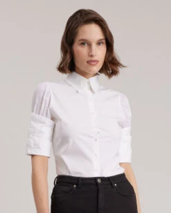 The clean, modern look of the NOHANT poplin white boxy shirt will make you stand out amongst the crowd. Featuring a unique square collar and hidden button placket with two exposed black buttons that allow this collar to stand tall, this shirt is sure to be a wardrobe staple. NOHANT also features a straight bottom hem with side slits and back princess darts. The sleeves are pleated at the shoulder seams creating volume and are finished with a fitted jersey knit that features a poplin button placket showcasing four fixed black buttons.