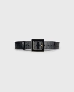The NORTH is a croc-embossed leather belt in black featuring a square metal buckle in gold and black enamel. This adjustable glossy leather belt will accessorize all your outfits for a more elegant and modern look. In the same theme, you will find the NESTOR bag and the NOEMIE boots.