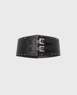 NUTS est une large ceinture en cuir noir ornée de clous métalliques argentés. Cette ceinture présente un style corset avec deux boucles de fermeture finies en argent. La NUTS s’ajuste parfaitement à la taille grâce à son support élastique. Disponible en trois tailles. Dans le même thème, vous trouverez les bottes NASHVILLE.