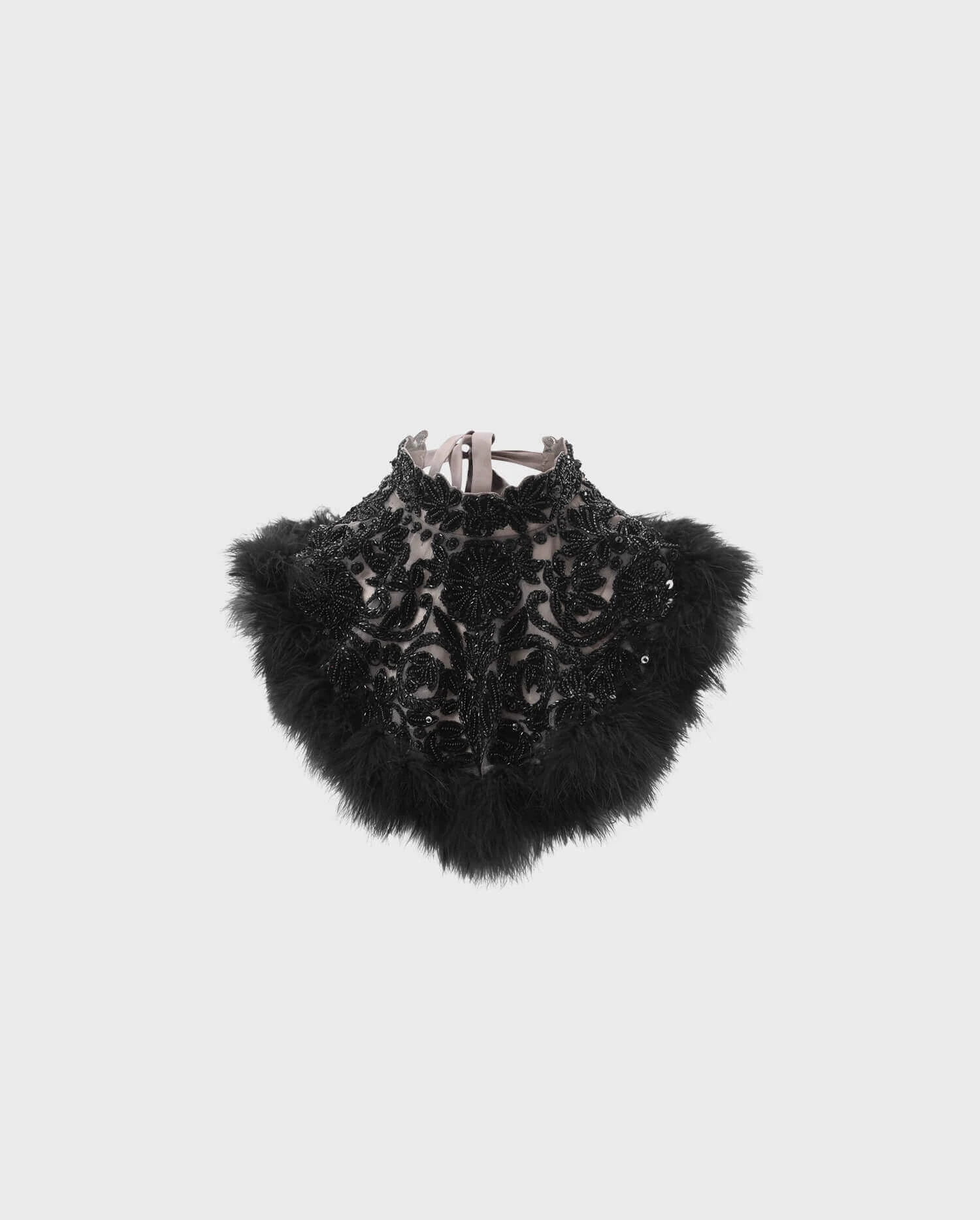The ODESSA is a black collar with embroidered beads and sequins embellished with fine ostrich feathers. This Precious and elegant bib collar features satin ribbons in the back for closure. The ODESSA with its details will add sophistication to every outfit you pair it with.