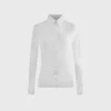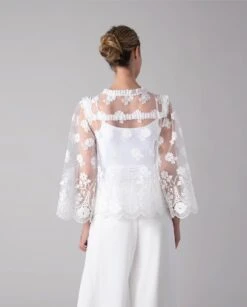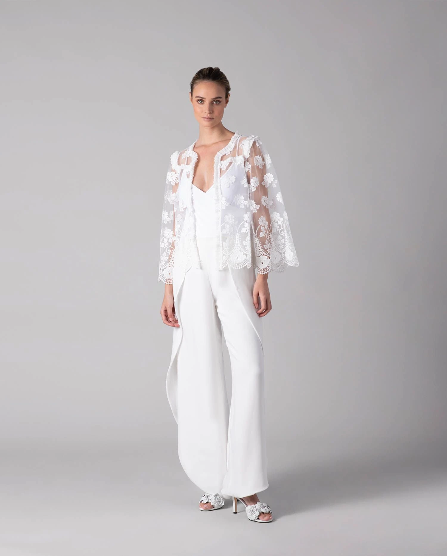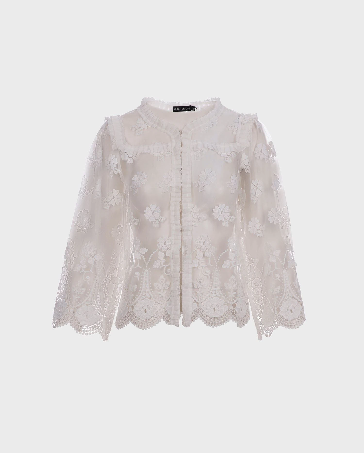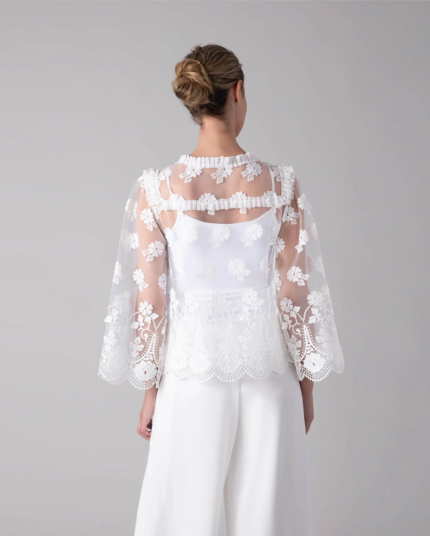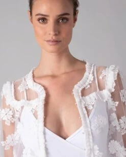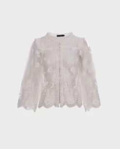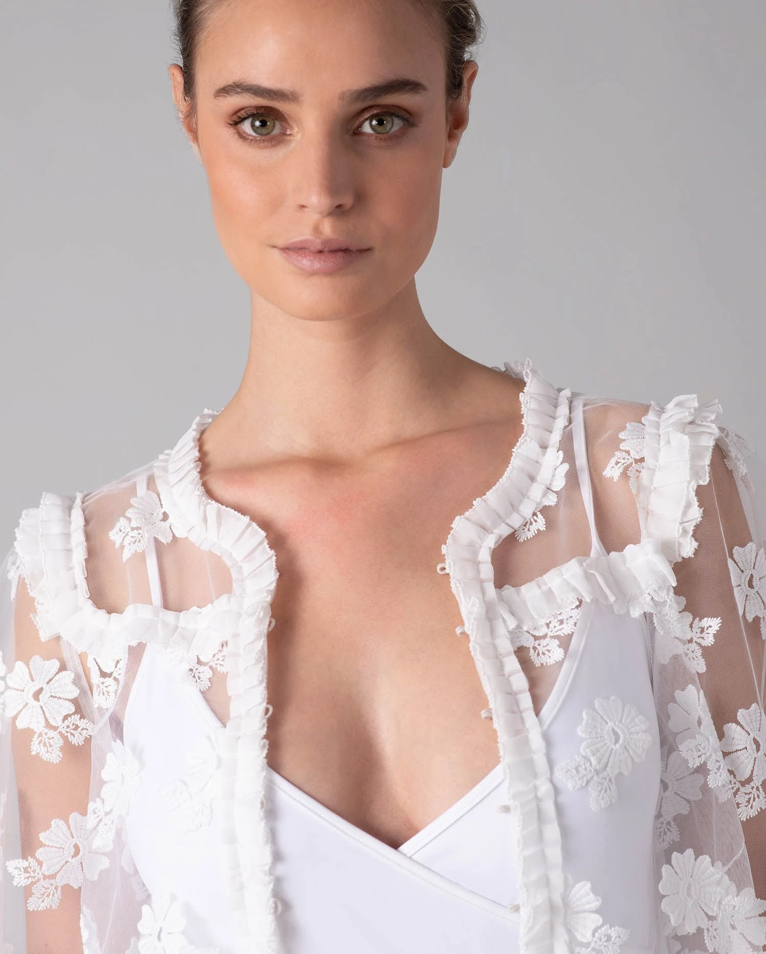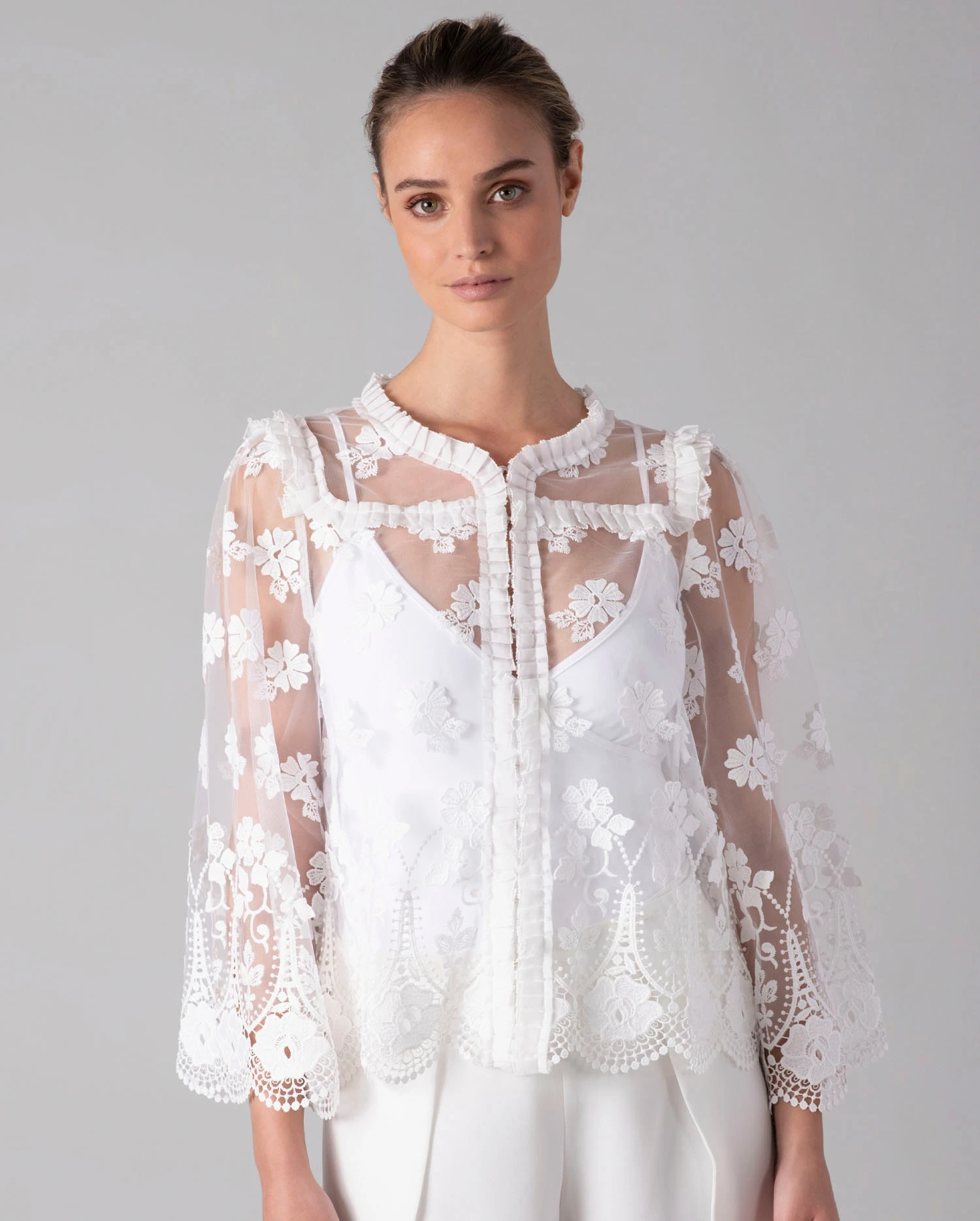 The PARVATI is a white tulle shirt embellished with a delicate white floral embroidery and scalloped edge at the bottom of the garment. The neckline, shoulders, back and front tab are trimmed with a decorative ribbon. This unique style features a hidden hook and eye closure and is cut for a slightly loose fit. The delicate embroidery and detailed artwork in this piece showcase the craftsmanship of La Maison ANNE FONTAINE.
