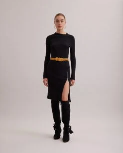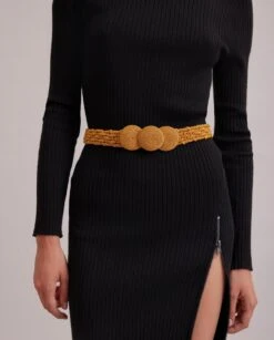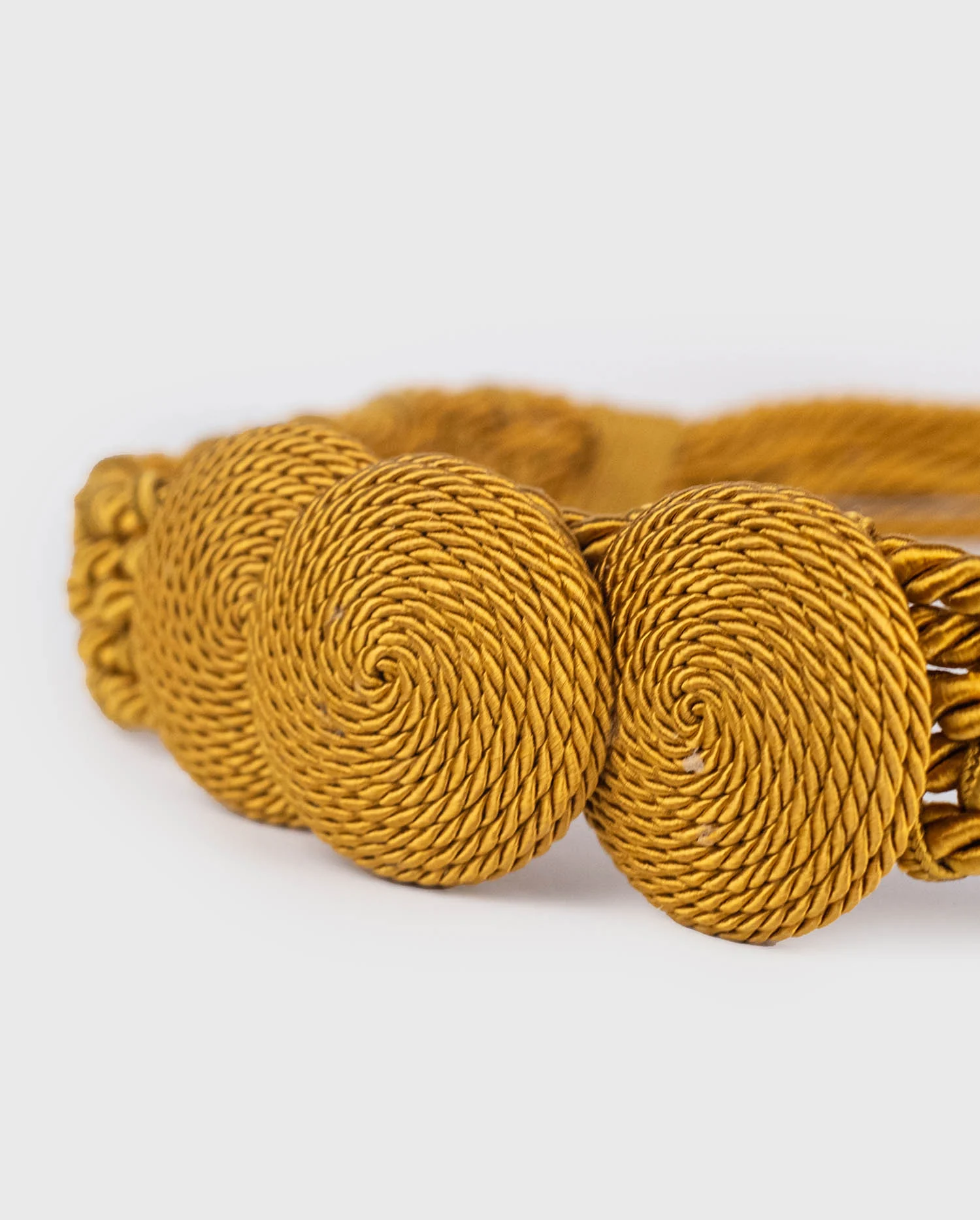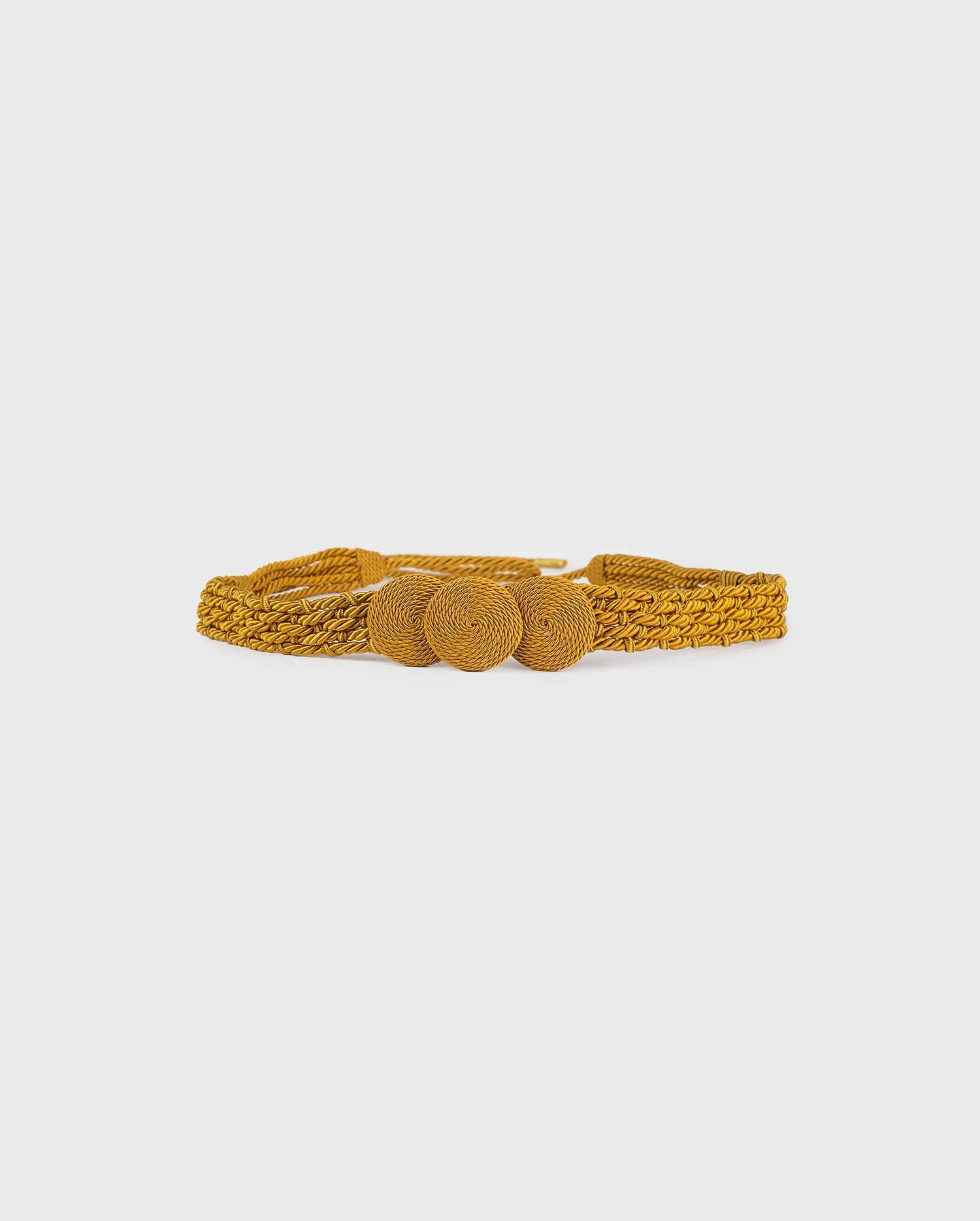 The PERKINS belt is a soft rope-like belt featuring four layers of twisted fabric that go around the waist and three center circles.