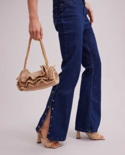 The ROSEAU is a rafia hand woven bag made in Brazil. The oblong circle bag features a triple ruffle front and a shoulder strap.