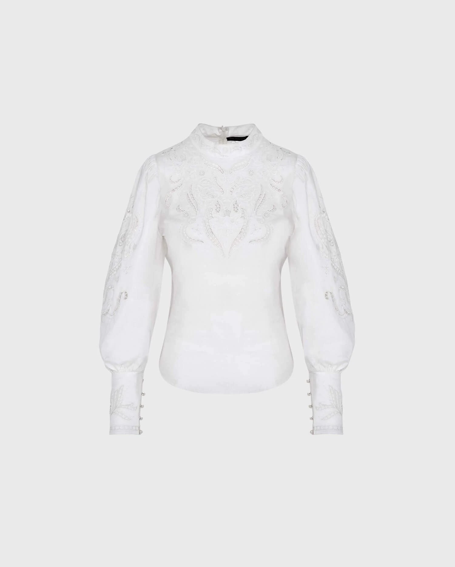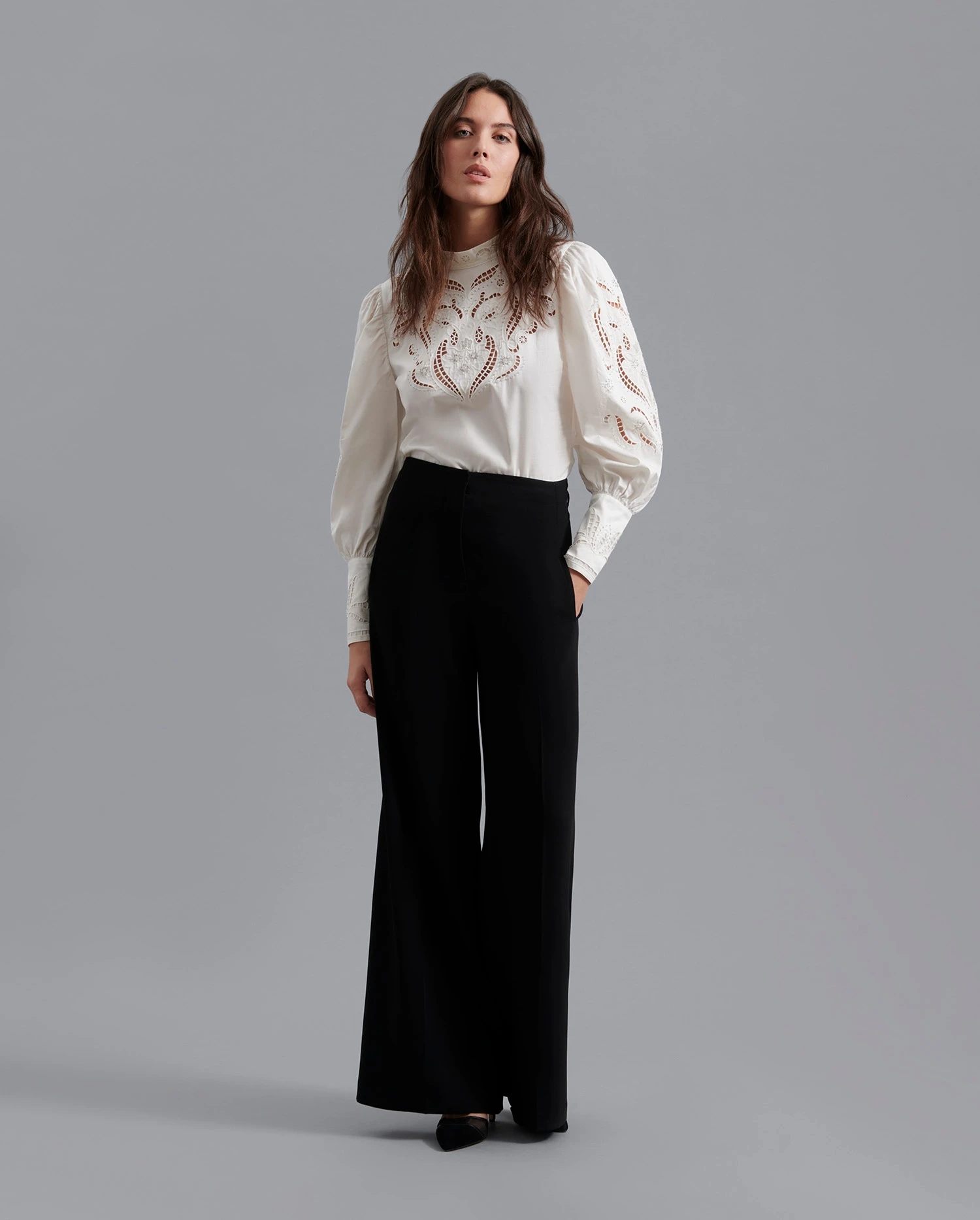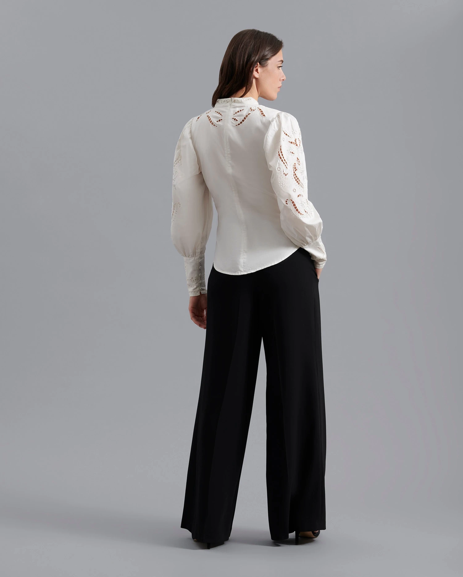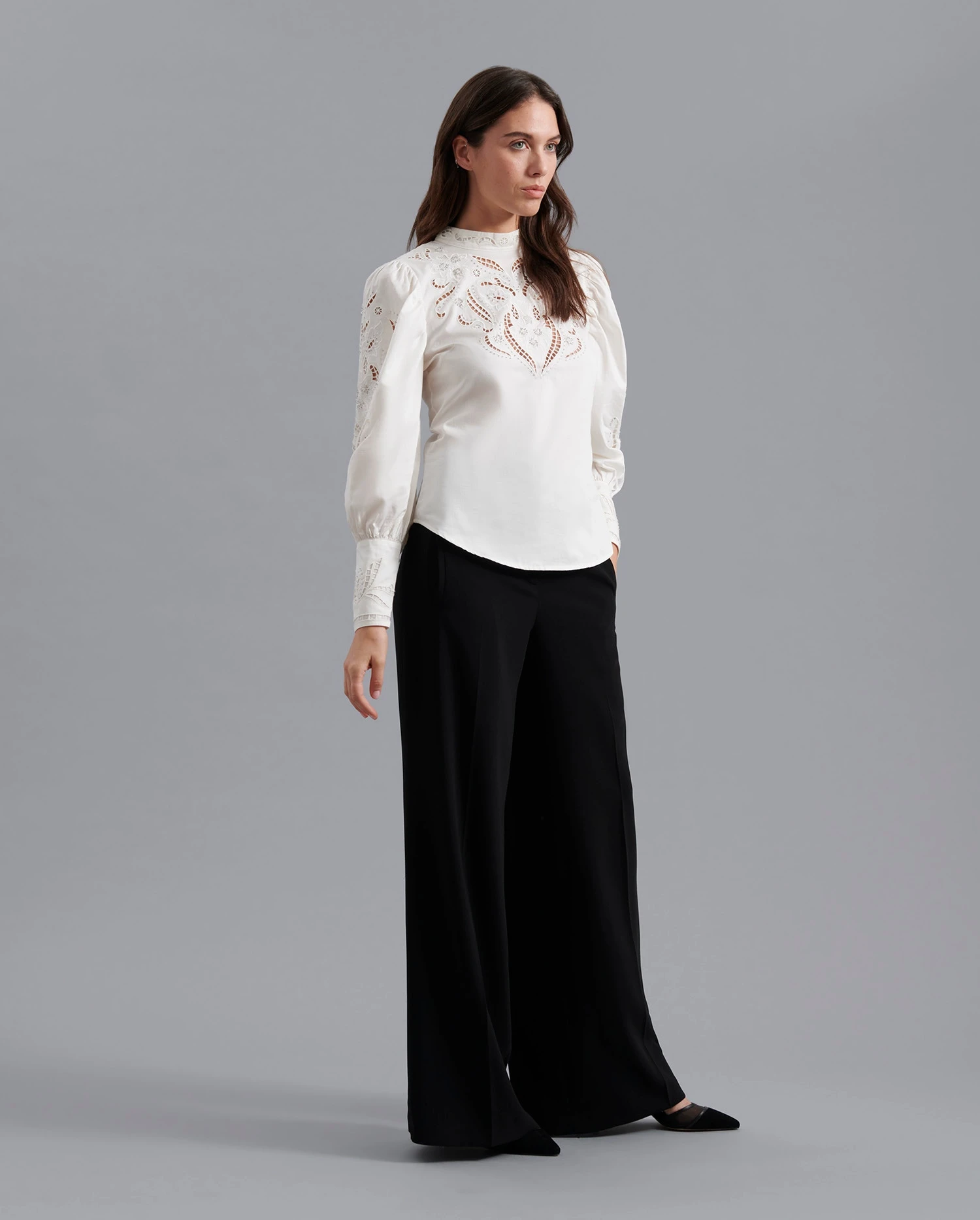 The SUCRE is a Victorian-inspired blouse in moon-white with openwork beaded embroidery and puff sleeves with long buttoned cuffs. This blouse features bust darts and a curved hemline with a slightly loose fit. The hand-embroidered beads showcase the expertise and knowledge of Anne Fontaine’s workshop, making this an exceptional piece.