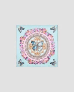 We enter the castle of Versailles and admire its bucolic gardens. Majestic flowers are accompanied by a whimsical dance of butterflies in excitement of the splendor of the courtyard. A glimpse inside the window reveals intricate moldings of the royal apartments that adorn the center of the silk square.