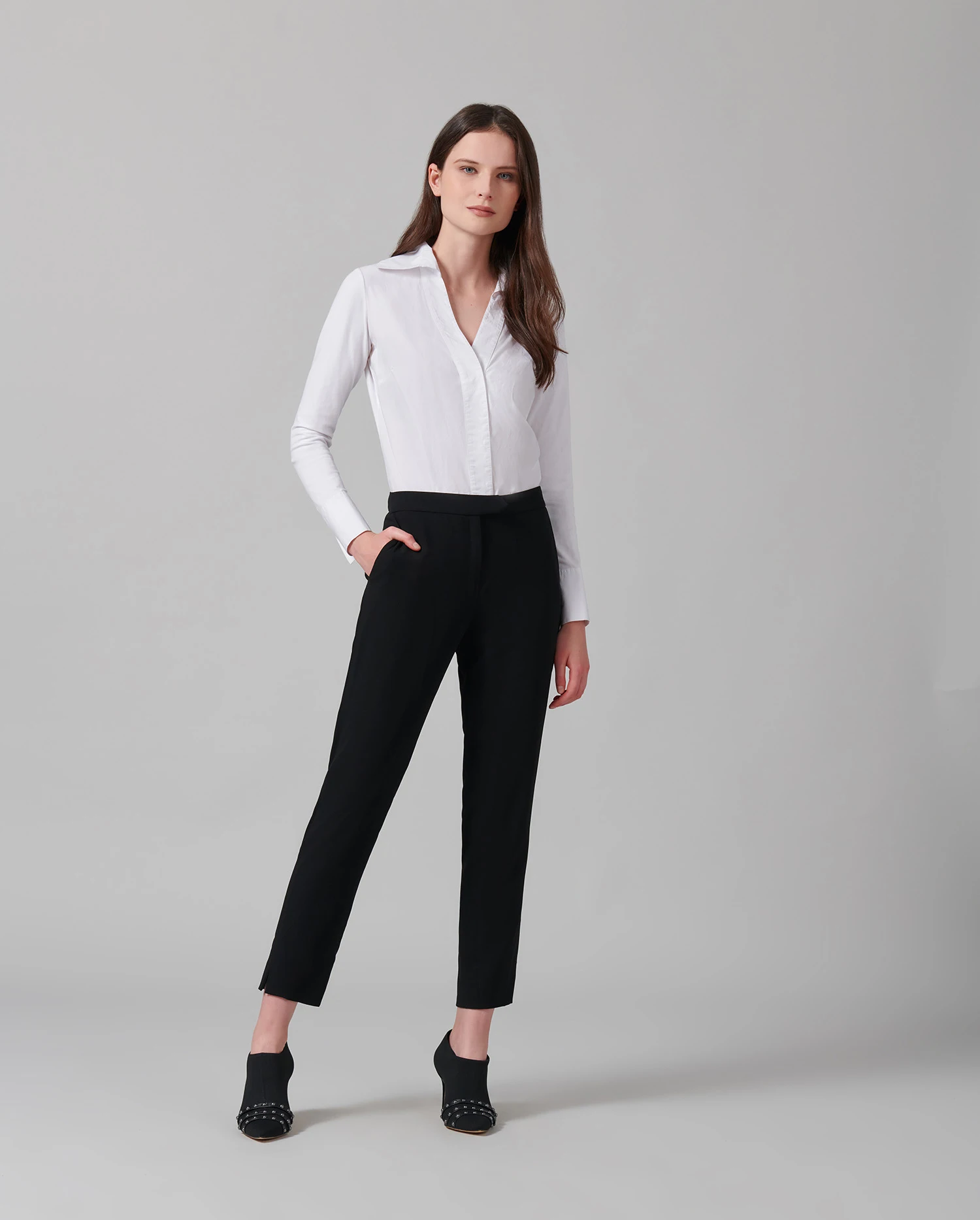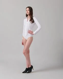 The VERENE is a bodysuit with a poplin front and Pima jersey back and sleeves. This bodysuit features darts at the bust, a thick concealed front placket that has snaps for closure, and a large pointed collar that gives way to a deep V-neckline. The long sleeves are finished with French cuffs that allow for decorative cufflinks. The VERENE bodysuit is finished with a thong base made of a soft Pima jersey that closes with snaps.