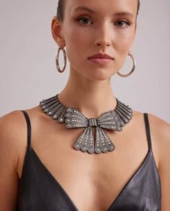 The VERLAINE is a meticulously linked metal bow collar encrusted with crystals. Inspired by the delicate ribbons of a crystal chandelier, the collar sits at the nape of the neck and catches light beautifully as you move. It’s our stunning signature piece, and one to be cherished for years to come.