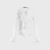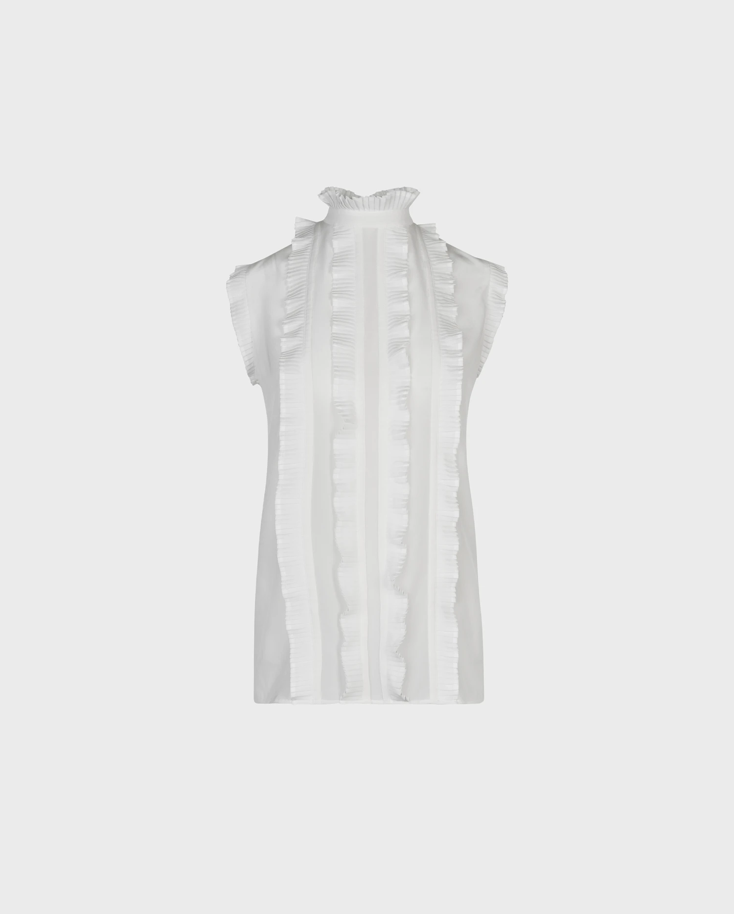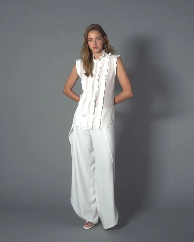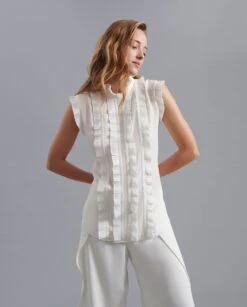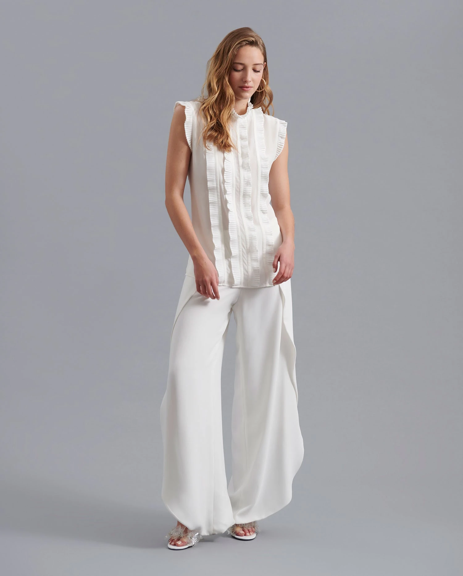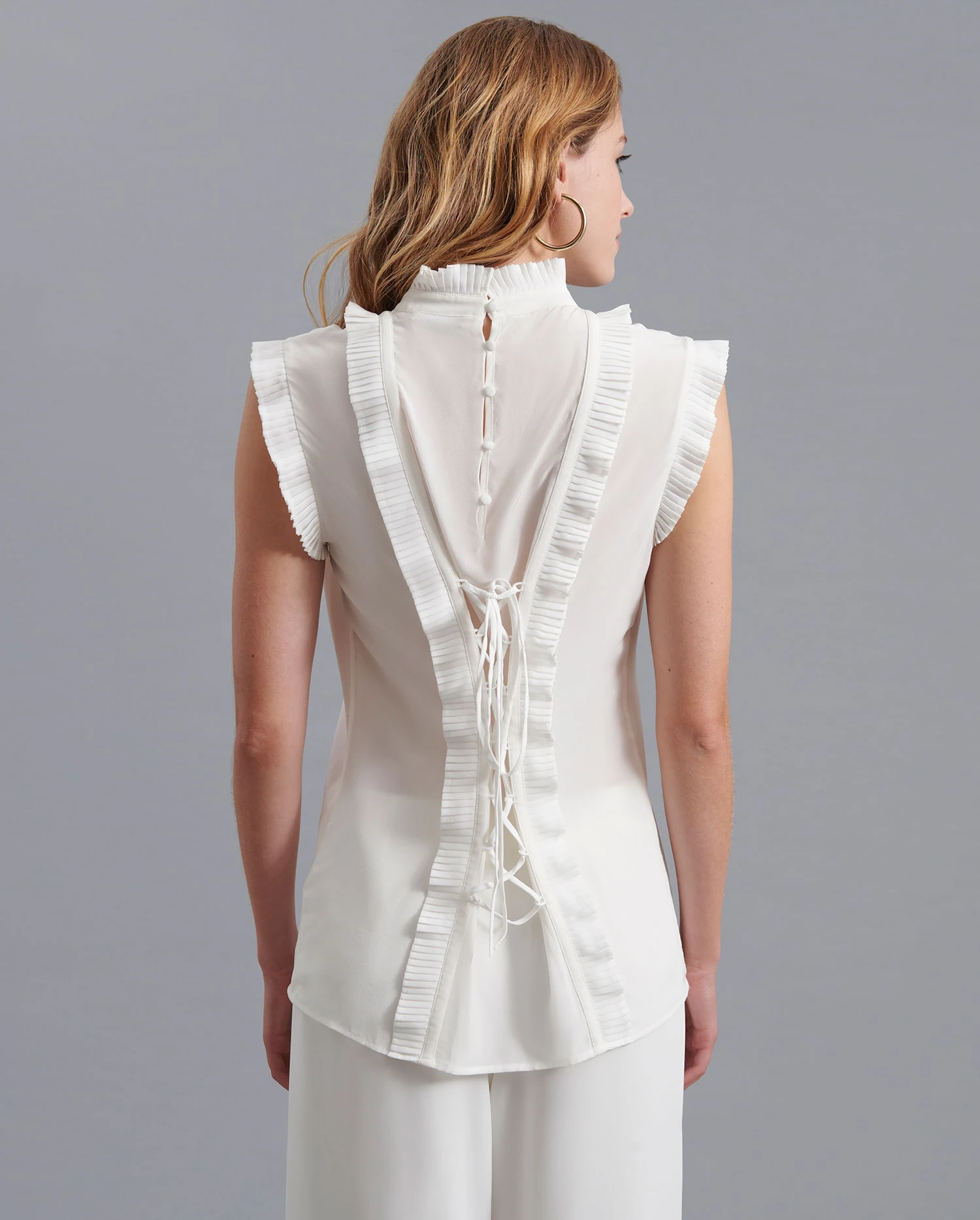 The VINNY is a cap sleeve silk blouse in featured in white for the Spring-Summer collection. The VINNY is enhanced with stitched down miniature pleating along the front of the silhouette and is completed with an adjustable corset in the back that allows this blouse to fit close to the body.