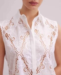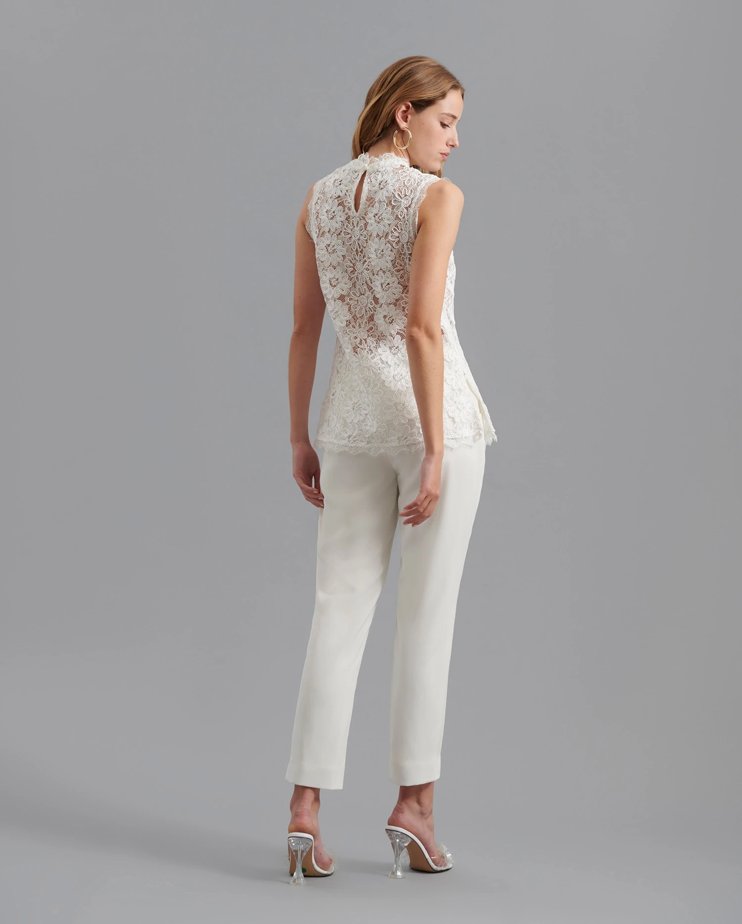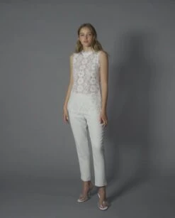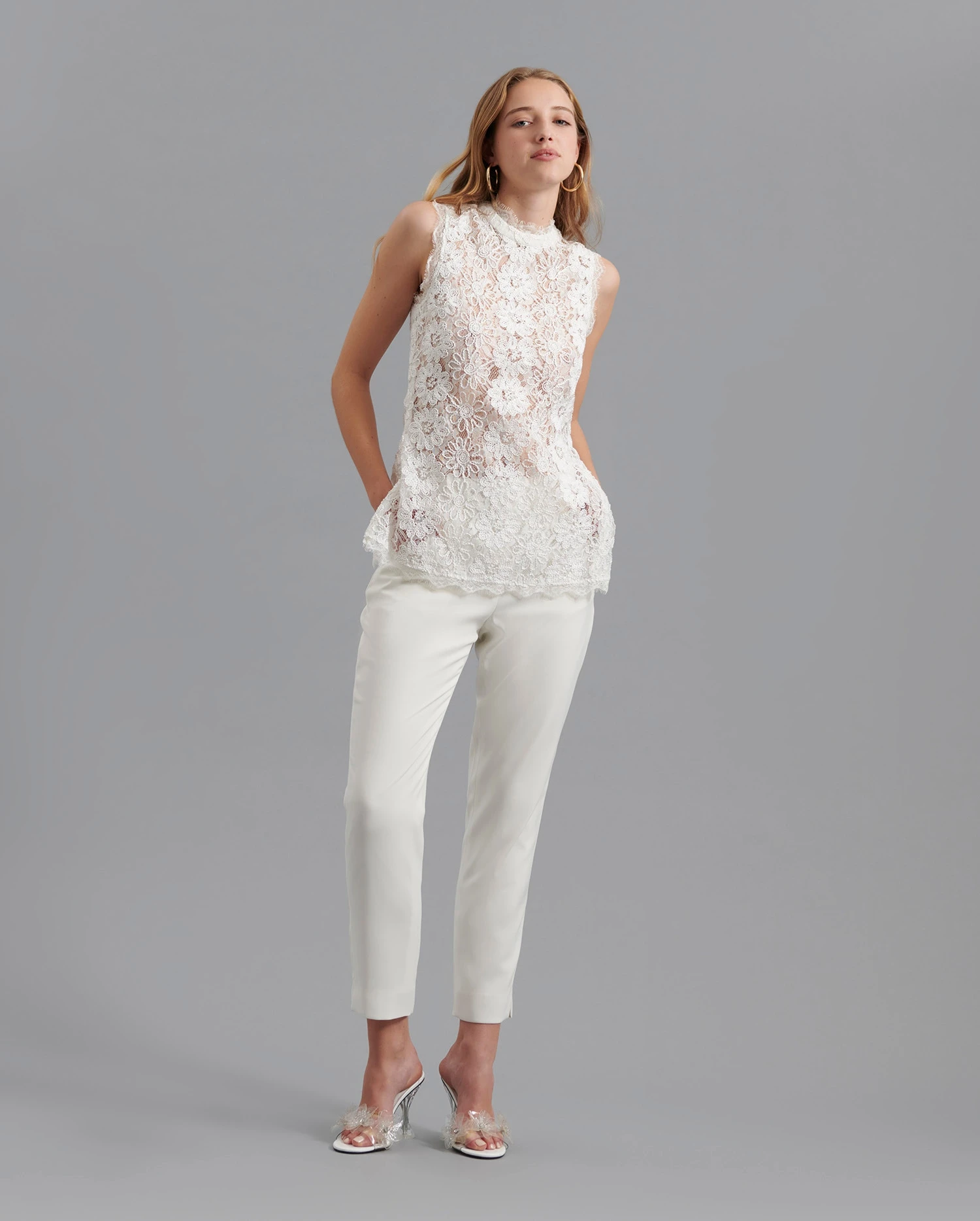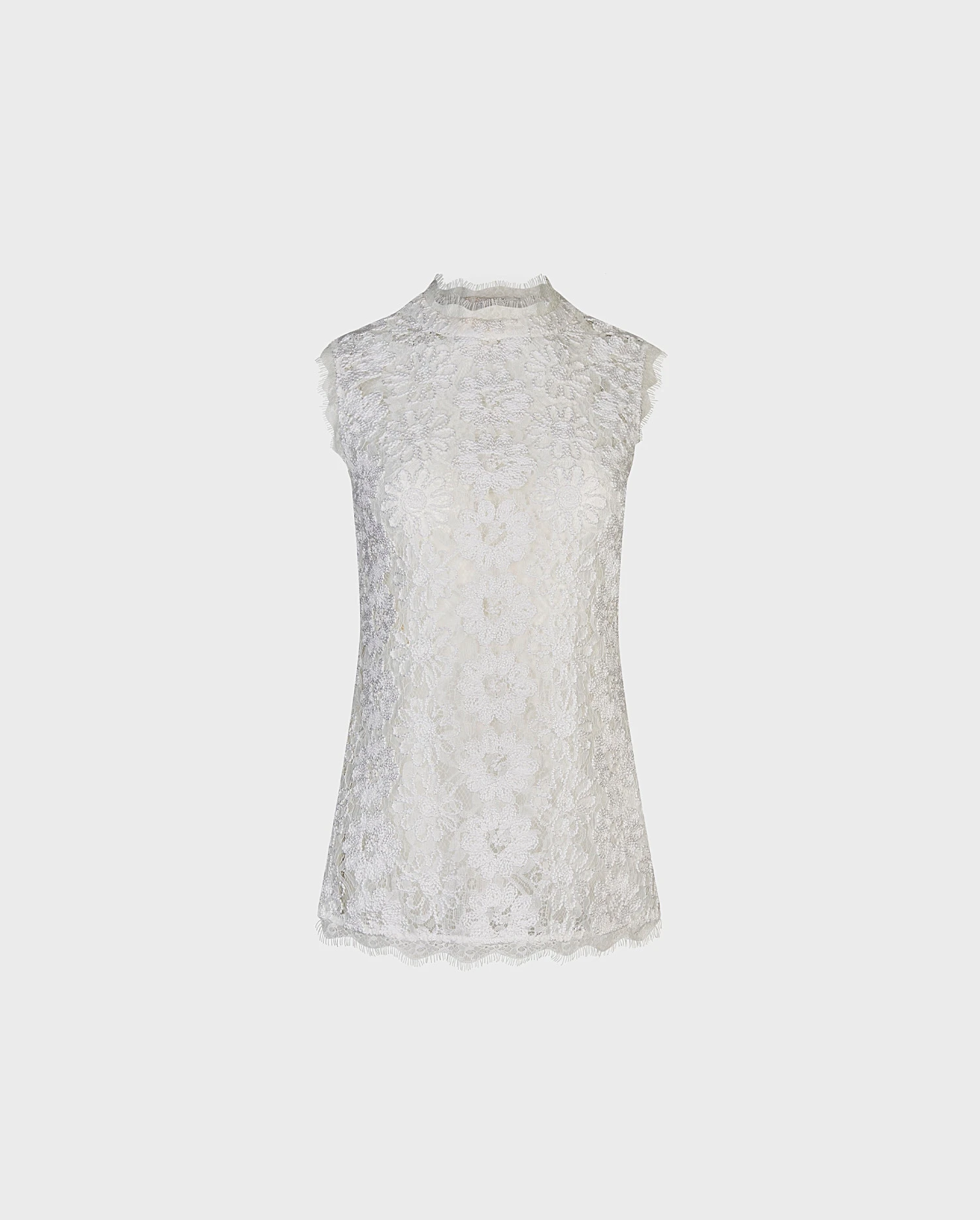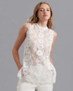 The VOLINA is a dense corded, floral embroidered lace blouse in white. This sleeveless, semi-sheer blouse features a mock neck collar, concealed zippers on the side seams, creating adjustable vents and a back button with keyhole detail for closure. The VOLINA blouse is embellished with eyelash lace trim at the mock neck, around the arms, and at the hemline.