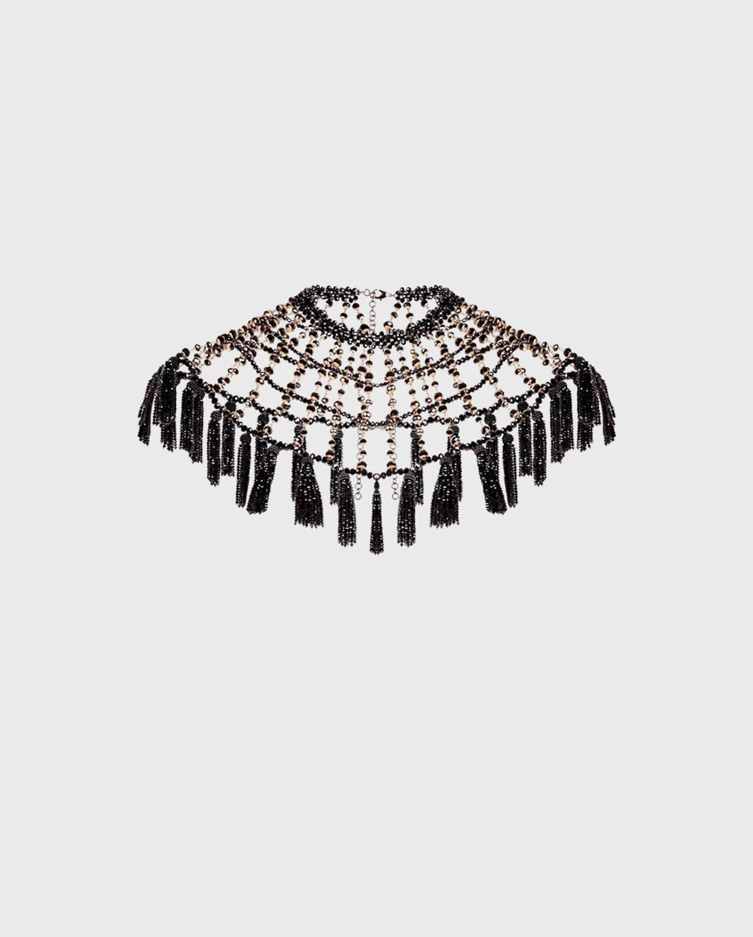 The WIKA is an elegant cape style collar decorated with beaded tassels and black beads with gold details. The collar fastens at the neck and back with two adjustable chains, for a perfect fit. This precious collar will propel your simplest outfits into a royal ambiance.