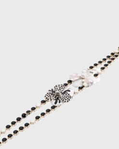 The WISLEY is a black and white enamel link belt that features two flowers and a double chain on one side. This belt is adjustable with a chain and clasp closure. In the same theme you will find WINK cufflinks.