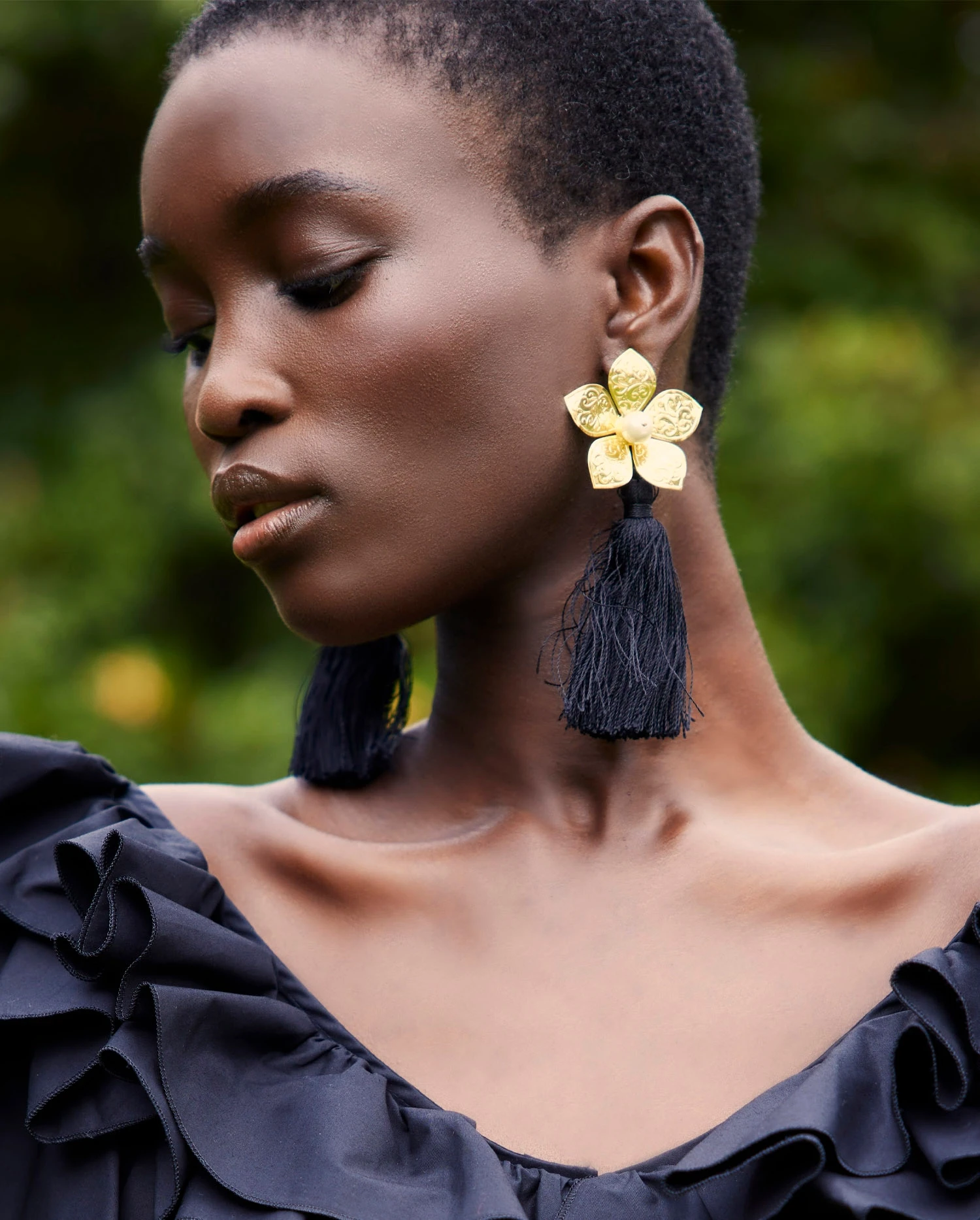 The WIVINE are clip-on earrings with a gold flower adorned with a center pearl and black tassels that will frame your face with elegance. The foam protection at the clip allows you to wear them in comfort. The ANNE FONTAINE logo is subtly engraved on the earrings clip.